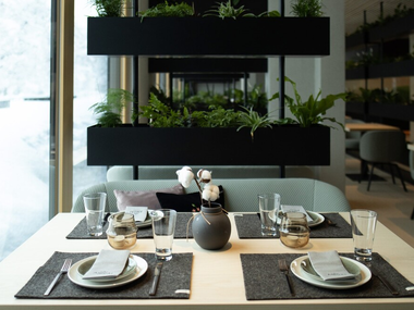 Wir empfangen unsere Gäste sowohl in unseren drei architektonisch unterschiedlich gestalteten Stobas - in AMRAIs-Stoba, in der Grünen Stoba oder in der Holz-Stoba - als auch auf der weitläufigen Terrasse. Dafür musst Du übrigens kein Übernachtungsgast sein. Unsere aktuellen Öffnungszeiten findest Du auf unserer Homepage. Wir freuen uns, wenn Du vorher reservierst.