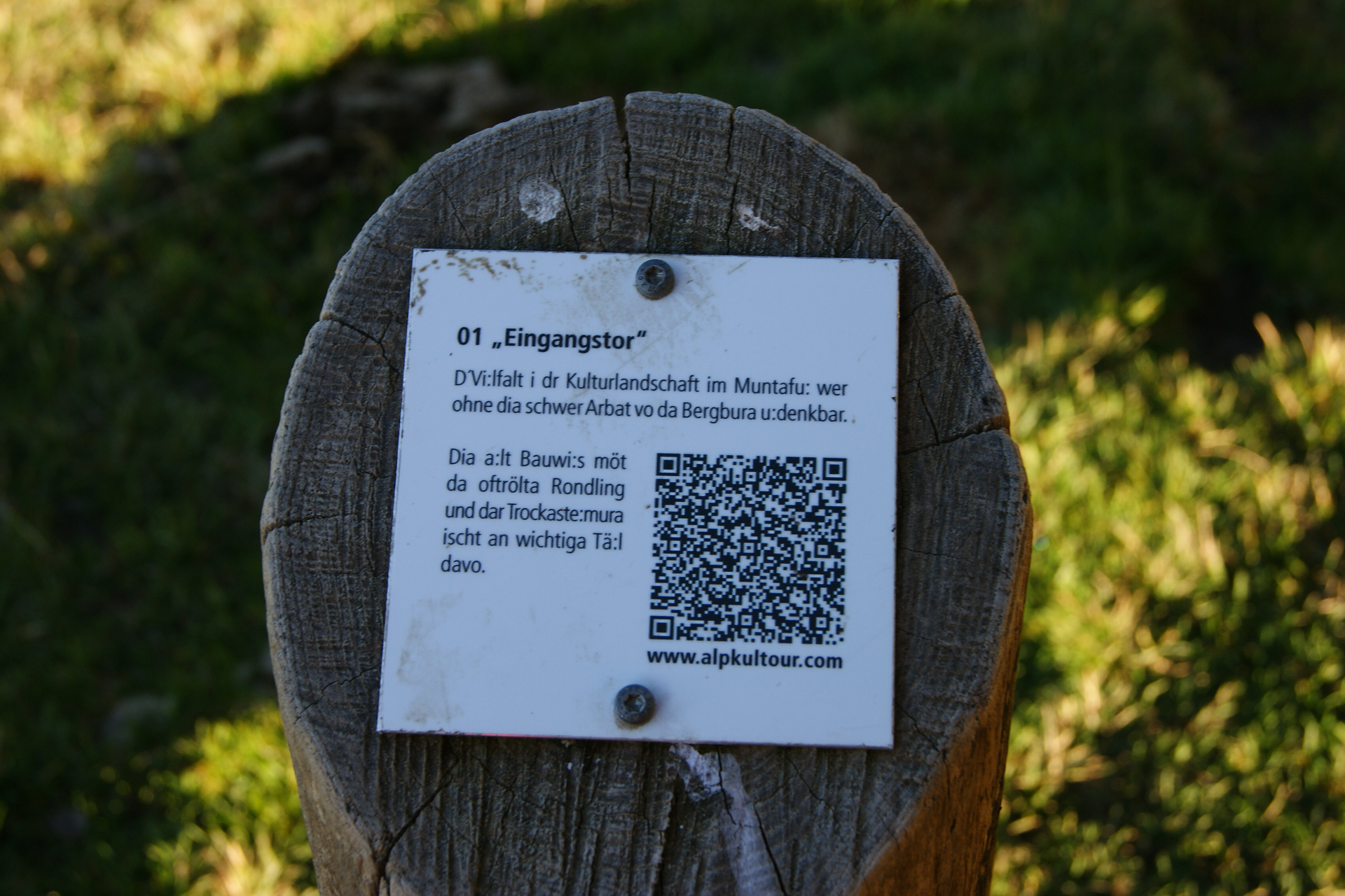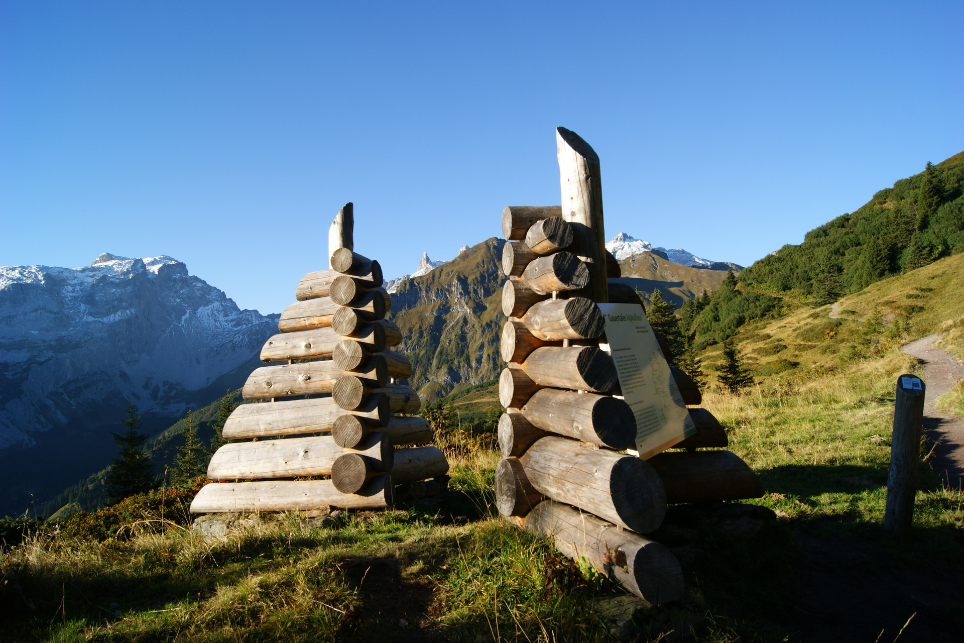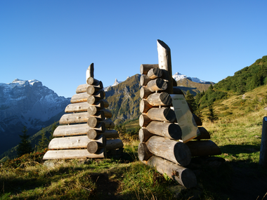 An 13 Stationen entlang des Weges laden Figuren des Montafoner Künstlers Roland Haas zum Staunen, Wundern und Nachdenken über alpine Lebens- und Arbeitsweisen ein. Der Weg beginnt beim „Eingangstor“, zwei Gebäudekanten, die in traditioneller Holzbauweise errichtet sind. Weiter auf dem Weg sieht man den „Mythenbaum“, eine umgedrehte Fichte, deren Wurzeln in den Himmel ragen und eine Verbindung zwischen dem Diesseitigen und der „Anderswelt“ herstellen. Rote Pfeile machen einmal auf Wasser, ein anderes Mal auf ein vom Wald verschlungenes Haus aufmerksam. „Die Tribüne“ lädt ein, Platz zu nehmen und den Blick über das Gauertal schweifen zu lassen. „Der Lawinenbockbaum“ weist auf die Gefahren im alpinen Raum hin. Er ist die einzige Skulptur, die nicht aus Fichtenholz geschaffen ist, sondern – wie die echten Lawinenböcke – aus sehr hartem, widerstandsfähigem Robinienholz. Zum Schluss verweist „Der Geweihbaum“ auf die enge und nicht immer ganz reibungsfreie Beziehung zwischen Jagd und Alpwirtschaft.