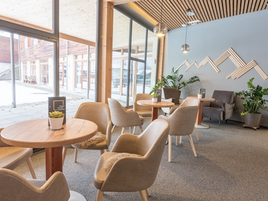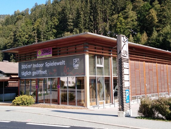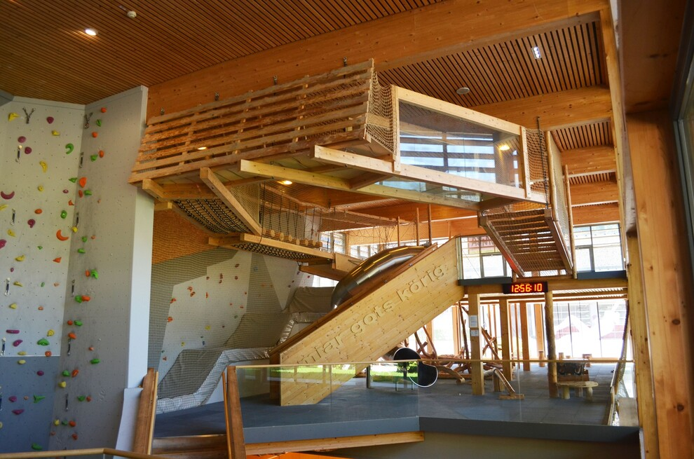 Bistro mit kleiner Karte, Zentrum mit Spiel- und Bewegungsparcours, großer Abenteuerspielplatz.