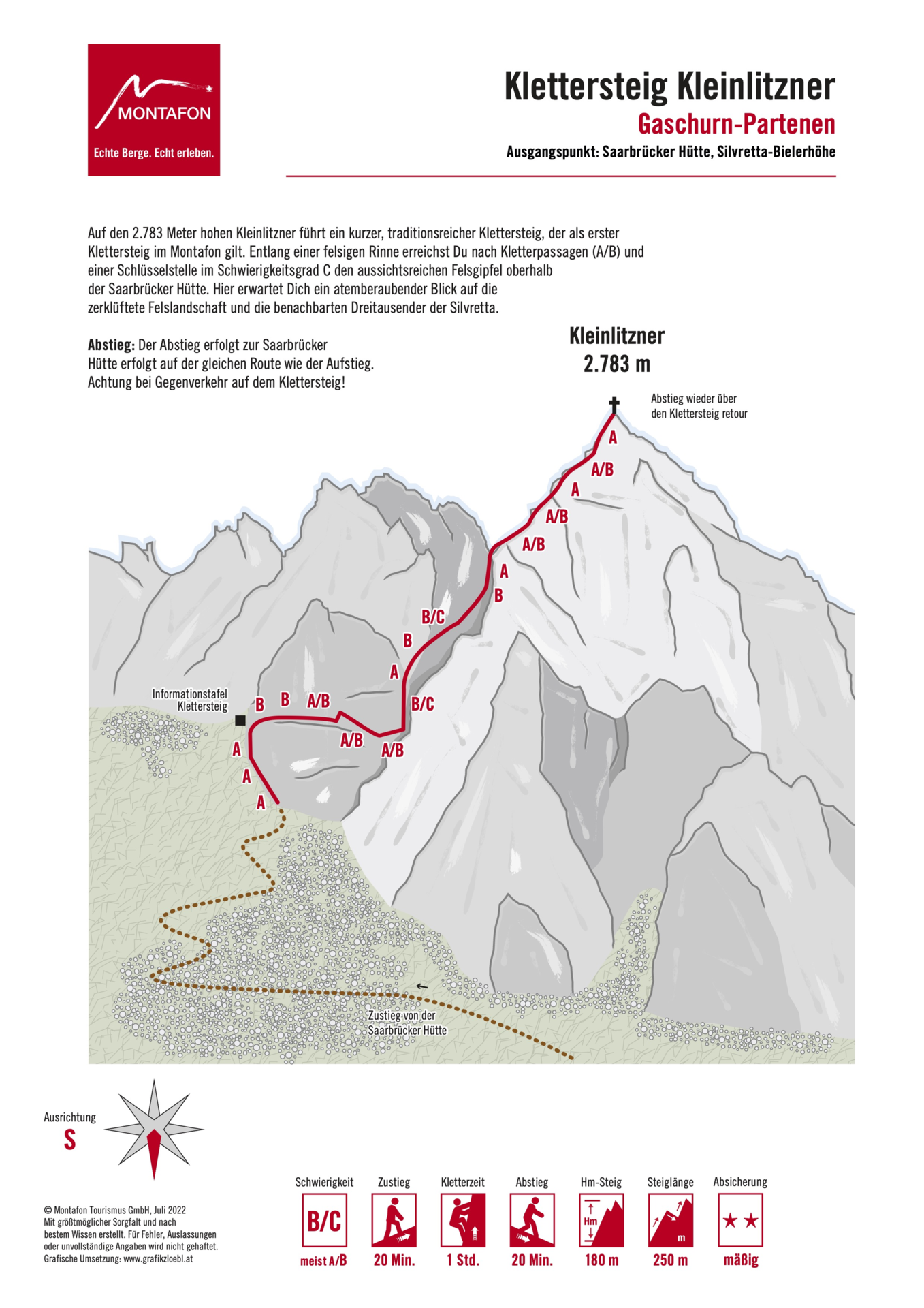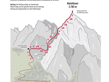 Zustieg: Direkt hinter der Saarbrücker Hütte erhebt sich die Felsformation des Kleinlitzner. Der Einstieg zum Klettersteig befindet sich ca. 350 Meter südlich der Hütte und ist leicht erreichbar.