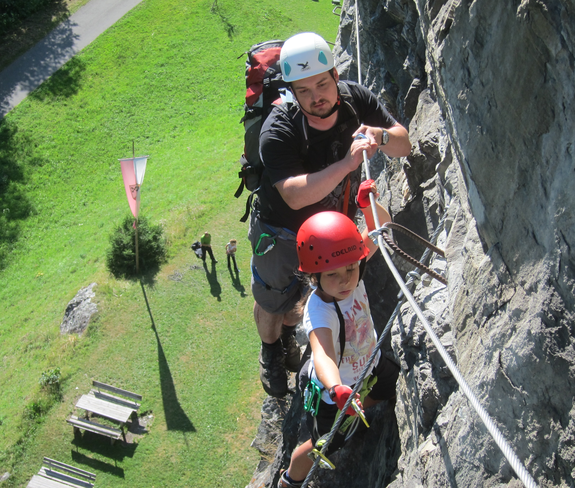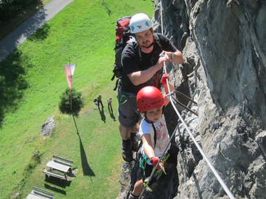Neben dem Rifabecken, zwischen Gaschurn und Partenen, findest Du den Übungsklettersteig Rifa im gleichnamigen Klettergarten. Mit einem gut abgesicherten Anfängerklettersteig A/B eignet sich dieser als ideales Übungsgebiet für erste Erfahrungen am Fels – auch für Kinder. Mehrere Varianten im Bereich C versprechen Abwechslung für fortgeschrittene Klettersteiggeher. Ein Höhepunkt für alle ist mit Sicherheit die Hängebrücke sowie der imposante Blick auf die Vallüla (2.813 Meter) am Talende des Montafon. Um den Klettergarten lädt ein großzügiges Areal mit Wasserspielplatz, Grillstelle und Co. zum Verweilen ein.