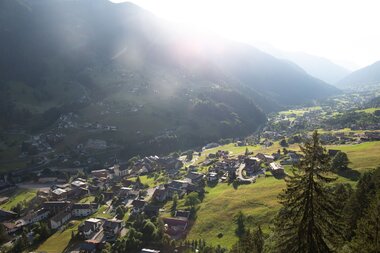 Zunächst fahren wir dem Bach entlang am asphaltierten Radweg leicht aufwärts nach Partenen. Das kleine Dorf am östlichen Ende des Tals gehört zu den vermutlich schönsten Orten in der Umgebung. Nach dem Ort kommen wir zur Abzweigung, die links ins ruhige Ganifertal führt. Die Straße ist für den öffentlichen Verkehr gesperrt, trotzdem kommen hin und wieder Autos von Jägern und Bauern entgegen. Für Radfahrer ist es hier jedenfalls deutlich angenehmer, als auf der teils viel befahrenen Silvretta Hochalpenstraße, über die wir die Runde am Nachmittag beenden werden.