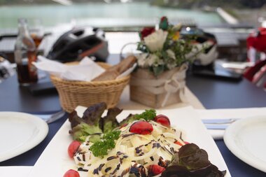 Geschafft! An der Bielerhöhe kehren wir zum Mittagessen auf der schattigen Terrasse des Silvretta Haus mit Blick auf den Stausee und den dahinter liegenden höchsten Berg Vorarlbergs ein. Trotz der Höhe (wir befinden uns auf 2.032 m) ist die Sonne hier noch stark und heiß. Auf der Speisekarte finden sich alle möglichen Schmankerln wieder. Besonders schön ist es nachlesen zu können, woher die Lebensmittel kommen. Rind- und Schweinefleisch aus der Metzgerei in Tschagguns, Eier aus Rankweil, Dinkelprodukte aus Buch, usw. Ich entscheide mich für ein Gericht, welches es ohnehin nur im Montafon gibt: sauer marinierten Sura Kees. Eine herrlich leichte Mittagskost für diesen Tag!