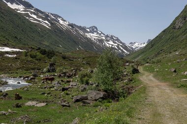 Mit neugewonnener Power geht es nun bergab in Richtung Galtür und dann wieder nach oben zur Bielerhöhe. Selbst mit E-Bike kommt man hier gut ins Schwitzen. Der Weg führt neben der Straße. Hin und wieder macht es aber auch Sinn ein Stück auf der Mautstraße zu fahren, zum Beispiel dann, wenn eine Herde Kühe einem den Weg verstellt und nicht erfreut über Besucher ist. Dann weicht man potenziellem Ärger besser aus… und genau das machen wir auch. Von der anderen Seite können wir die Tiere beobachten, wie sie am Fluss grasen, als könnte sie nichts und niemand stören.