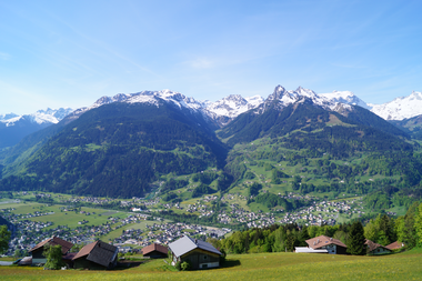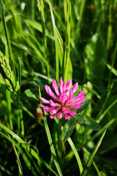 Als ich den Wald durchquert habe, eröffnet sich ein wunderschönes Plateau, auf dem sich das historische Bergwerk befindet. Ich beschließe den Moment zu genießen und lasse mich gemütlich auf einer Bank nieder, packe meine Fotokamera aus und halte die wunderschöne Aussicht auf die markanten Gipfel des Rätikon fest. Die pinken Blüten des Wiesenklees verleihen meinem Foto das gewisse Etwas. Ich nasche eine Blüte, die zuckersüßen Nektar enthält. Auch im Obstsalat und auf Kuchen oder zum Aromatisieren von Sirup und Säften ist die Blüte des Wiesenklees köstlich.