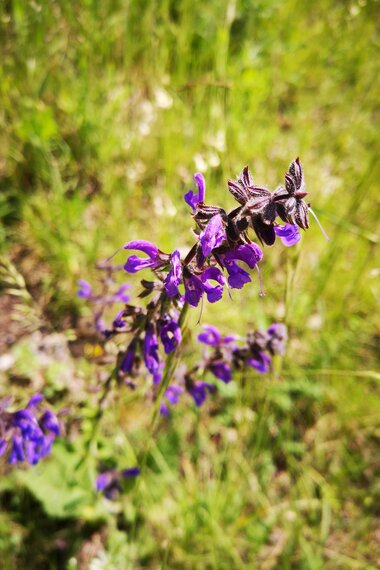 Das Summen einer Hummel lässt meinen Blick auf den hohen, lilafarbenen Wiesensalbei schleifen. Raffiniert ist der Wiesensalbei was die Bestäubung betrifft, die hauptsächlich Hummeln erledigen. Um an den köstlichen Nektar zu kommen, müssen sie ihren Rüssel ganz tief in die Blüte stecken, wobei sie einen Hebelmechanismus auslösen. Blitzschnell senken sich die oberen Staubblätter wie bei einem Schlagbaum und streifen ihren Blütenstaub auf dem behaarten Hummel-Hintern ab. Wenn die Hummel zur nächsten Wiesensalbei-Blüte fliegt, bringt sie auch den befruchtenden Pollen mit.