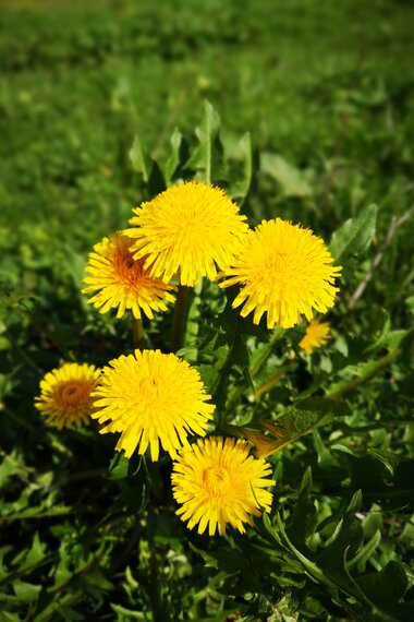 Reges Treiben herrscht auf dieser kunterbunten Blumenwiese. Die fleißigen Bienchen fliegen von einer gelben Löwenzahnblüte zur nächsten. Unglaublich, was sich in dieser Pflanze alles verbirgt. Die Wurzeln können zu geröstetem Wildkaffee verarbeitet werden, die jungen Blätter peppen jeden Salat auf und die gedünsteten Blütenknospen schmecken wie Rosenkohl. Als gelernte Konditorin stelle ich liebend gern Löwenzahnblütensirup und verzaubernde Löwenzahnmarmelade her. Löwenzahn ist entzündungshemmend, krampflösend und appetitanregend.