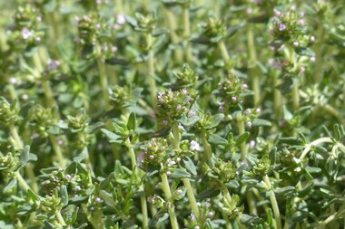 Nur wenige Schritte vom Ausgangspunkt entfernt versteckt sich ganz unscheinbar am Wegesrand der Bergthymian. Aus getrocknetem Thymian lässt sich köstliches Thymiansalz herstellen, das Fisch, Fleisch und Gemüse einen besonderen Geschmack verleiht. Wertvoll ist zudem seine entzündungshemmende, antibakterielle und schleimlösende Wirkung. Mit Honig zu Thymianhonig verarbeitet, kann man eine Erkältung und auch Magenbeschwerden natürlich behandeln.