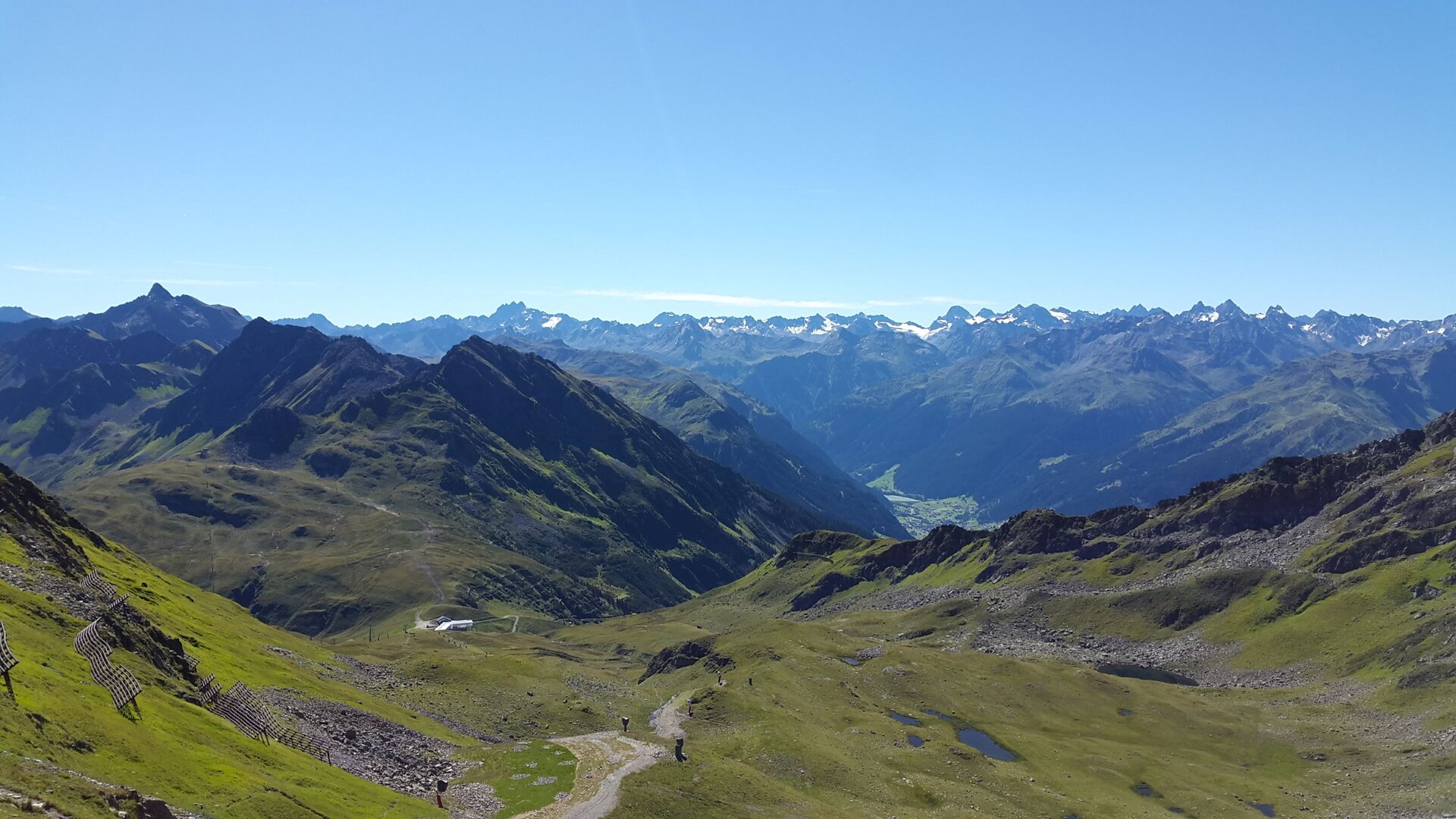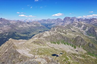 Das Silvrettagebirge mit dem höchsten Berg Vorarlbergs, dem Piz Buin, erstreckt sich imposant vor uns. Das Lechquellgebirge ist von hier aus ebenfalls gut zu sehen, sowie fast das gesamte Ländle. Durch seine isolierten Lage, versperrt uns kein anderer Berg die Sicht, lediglich das Wetter könnte uns hier ein Schnippchen schlagen.