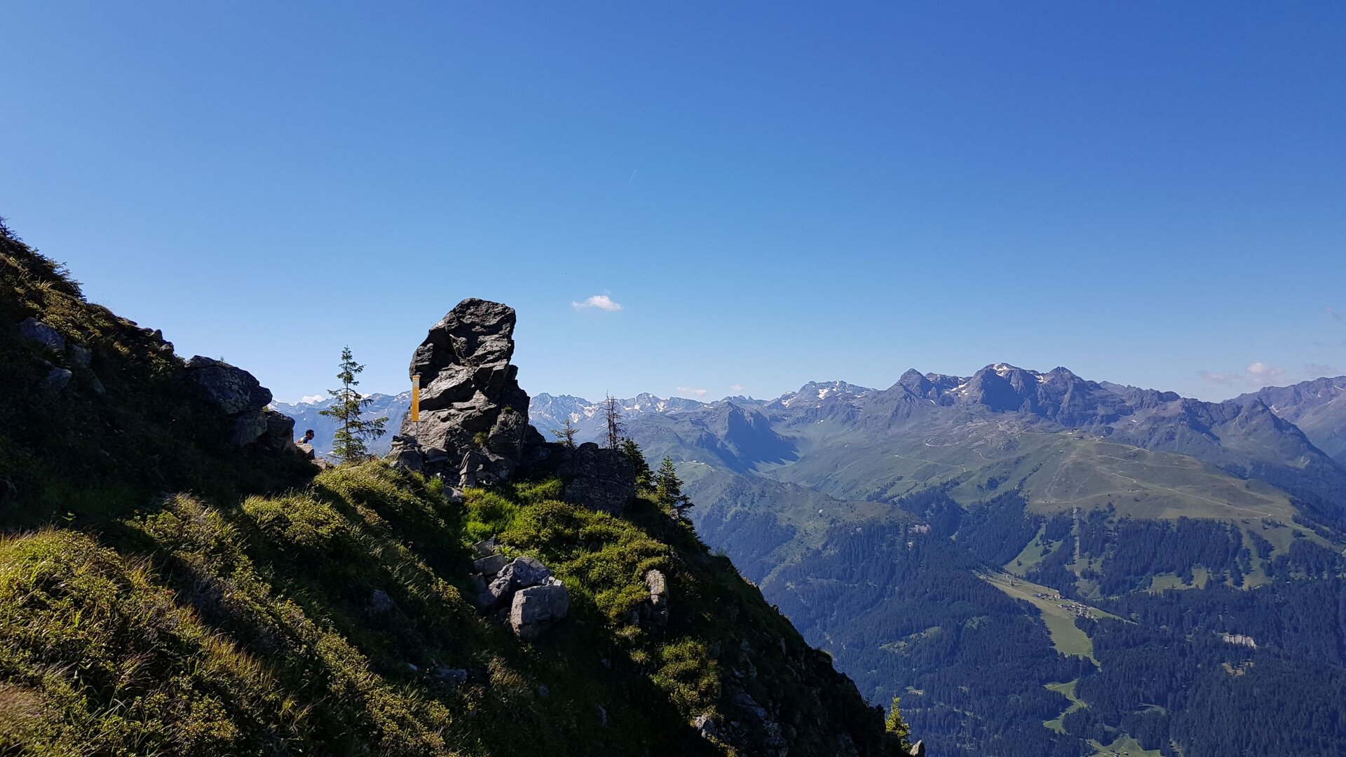 Mit vollem Elan starten wir unsere Tour auf einem schmalen felsigen Grat Richtung Valschavieler Maderer. Entlang eines Felsbandes zur Linken, wo wir immer wieder Blicke ins Seetal werfen können und zur Rechten steil abfallend mit großartiger Aussicht über die Gemeinden unter uns, erreichen wir nach ca. 15 Minuten Gehzeit die Wormser Hütte. Einige Gäste rüsten sich auch schon zum Aufbruch diverser Touren oder sitzen noch gemütlich beim Frühstück.