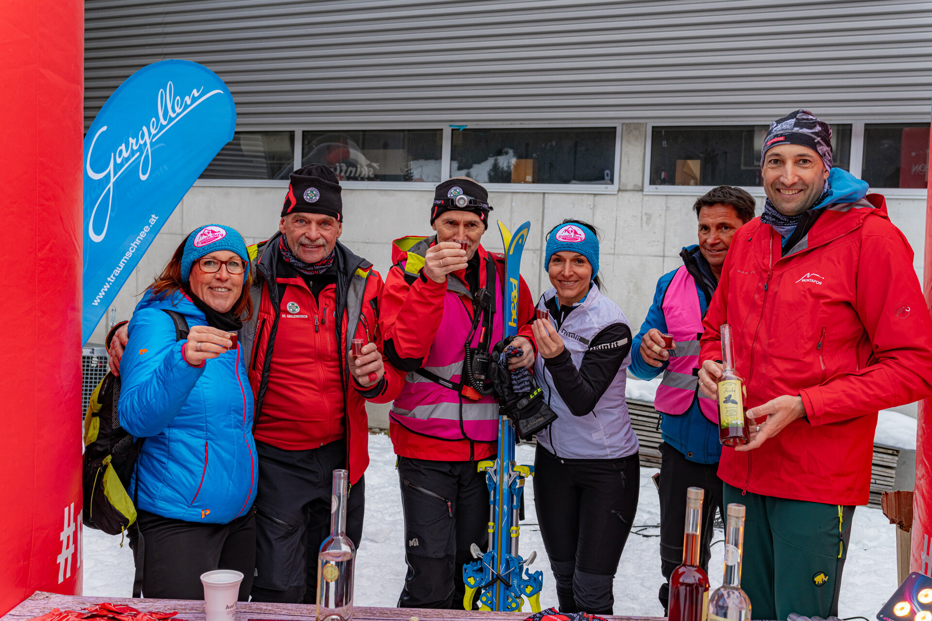 Gegen Ende der Strecke durften wir „Gaudi Ladies“ von einem ganz besonderen Service profitieren: Ein Schlepplift zog uns die letzten Höhemeter bequem in Richtung Ziel. Beim Abfellen, aber auch auf der Strecke wurden wir stets von hilfsbereiten Mitarbeitern, in pinken Westen versteht sich, unterstützt und angefeuert. Nach kurzem Kräftesammeln während der Liftfahrt, marschierten wir die letzten Meter gemeinsam ins Ziel, wo jede Aufsteigerin bereits unter Jubelrufen erwartet wurde. Was für ein Gefühl! Vom Zielgelände ging’s für alle Aufsteigerinnen direkt zur Hütten Gaudi ins Schafberg Hüsli, wo der Abend bei Live Musik und ausgelassener Stimmung natürlich gebührend gefeiert wurde.