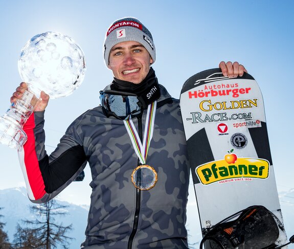 Als Snowboarder Alessandro Hämmerle – Spitzname Izzi – vergangenen Samstag die Stufen zur Alten Talstation in Gaschurn hinauf schritt, war die Begeisterung der Fans sicht- und hörbar. Der Schein mehrerer Dutzend Fackeln spiegelte sich in der Glaskugel und in den strahlenden Augen von Alessandro gleichermaßen. Gut bloß, dass er zumindest noch eine Hand frei hatte, um die Hände der unzähligen Gratulanten zu schütteln, die ihn minutenlang hochleben ließen. Im Hintergrund hatten sich die Frauen und Männer der Bürgermusik Gaschurn/Partenen mit Tracht und Hut schick gemacht, um dem frisch gebackenen Weltcup-Sieger musikalischen Respekt zu zollen. Im Inneren der Alten Talstation tauschte er die Glaskugel kurzerhand gegen ein Mikrofon, durch welches er gemeinsam mit seinen sportlichen Wegbegleitern die vergangenen Monate Revue passieren ließ. Darunter waren Manuel Bitschnau (Montafon Tourismus), Martin Netzer (Bürgermeister Gaschurn), Peter Marko (Silvretta Montafon), Walter Marinac (SC Gaschurn), Christian Galler (ÖSV Snowboard), Walter Hlebayna (Vorarlberger Ski Verband) und Alexander Borg (SC Montafon). Im Namen des Landes Vorarlberg applaudierten Landesrätin Barbara Schöbi-Fink und Landesrat Christian Gantner.