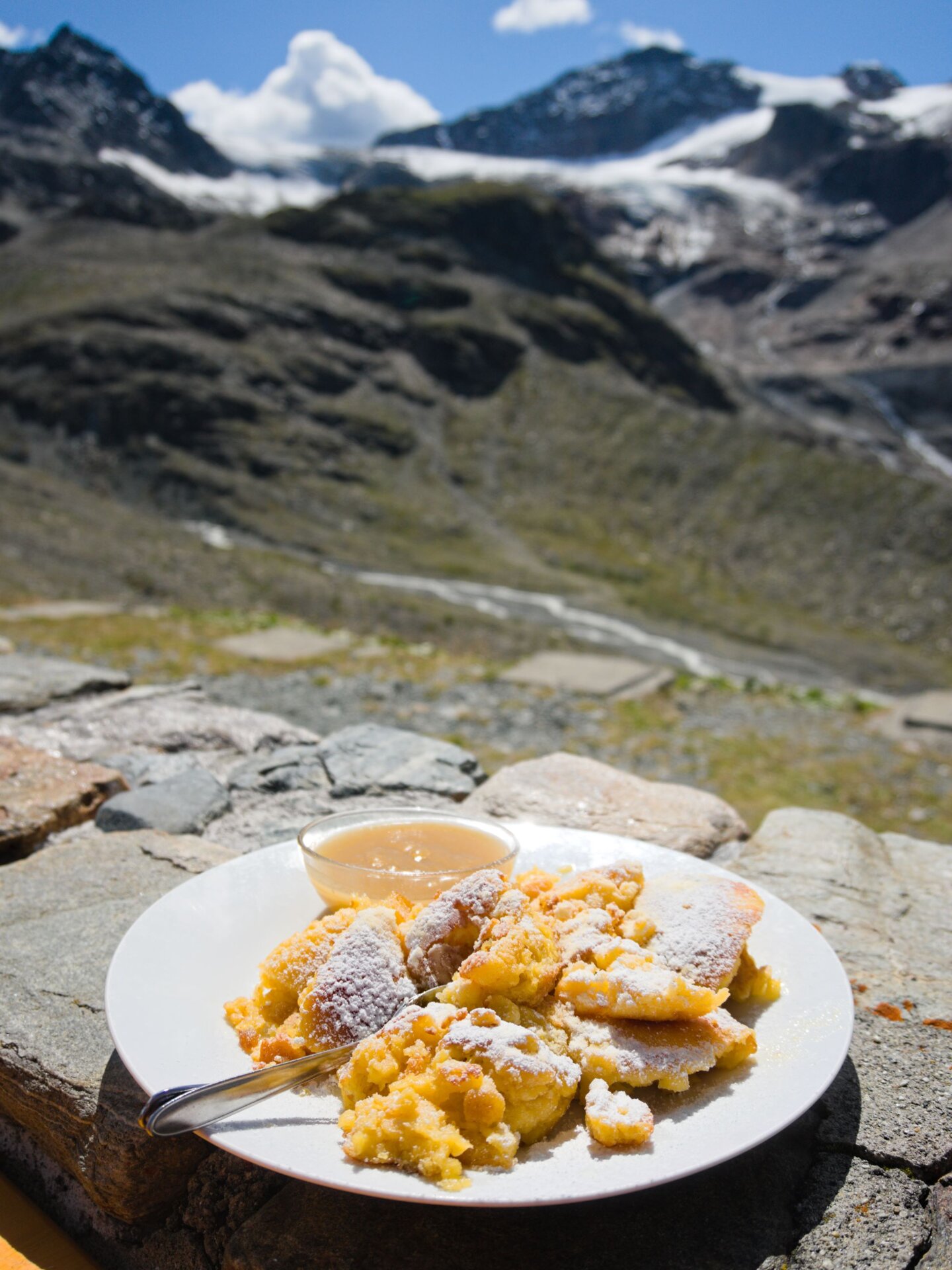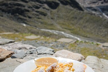 Aber die Zeit fliegt und wir haben noch mehr als die Hälfte der Tour vor uns. Also steigen wir über die felsigen Pfade des Edmund-Lorenz-Wegs zur Wiesbadener Hütte ab. Wir wandern vorbei an einem kleinen, glasklaren See. Am Ufer wiegen Wollgräser wie flauschige Wattebäusche im Wind. Den Piz Buin haben wir während dem gesamten Abstieg im Blick. Als wir an der Hütte ankommen, wimmelt es von Bergwanderern. Trotzdem finden wir noch ein Plätzchen auf der sonnigen Terrasse, wo Lisa und ich uns einen leckeren Kaiserschmarren teilen. Herrlich! Kann diese Tour noch besser werden?