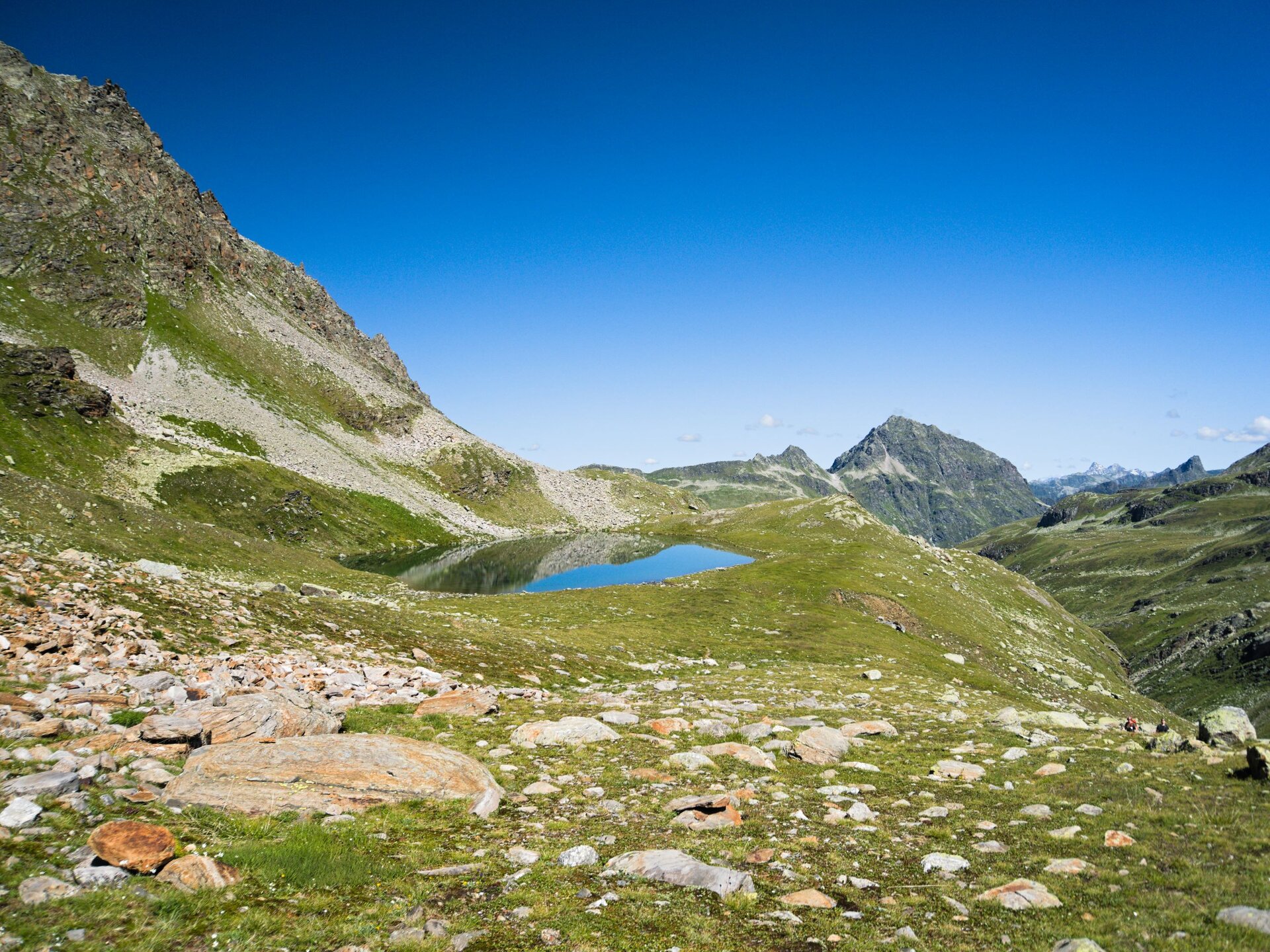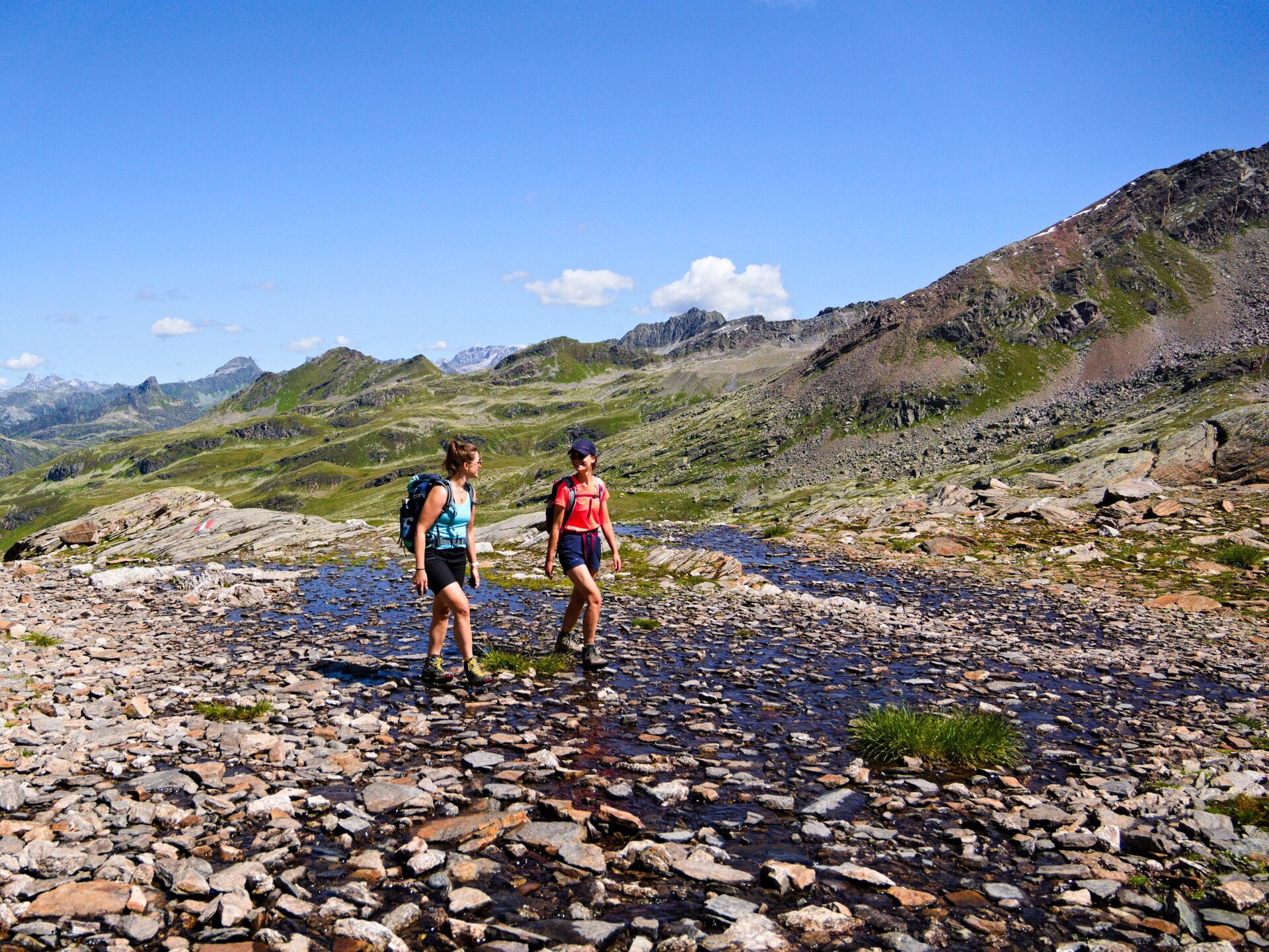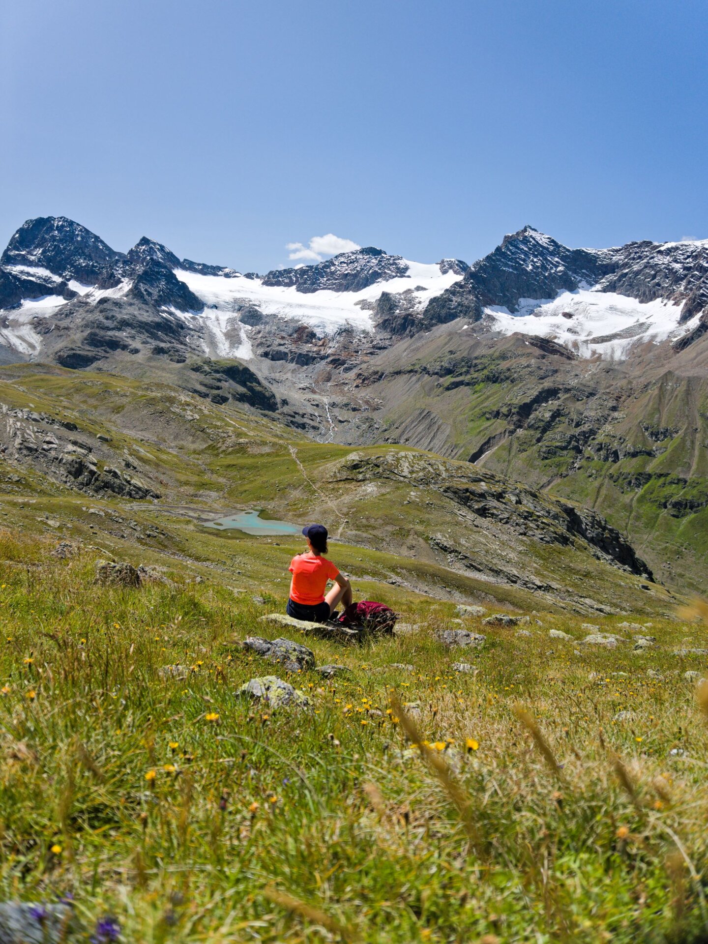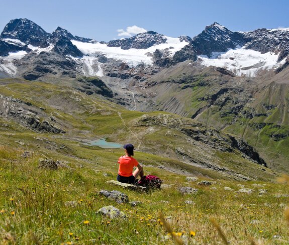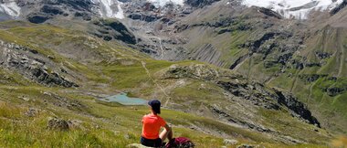 Die ersten Kilometer durch das Bieltal sind entspannt und idyllisch. Wir folgendem dem Lauf des Bieltalbachs, der sich durch den grünen Talboden schlängelt. Manchmal wird der Bachlauf durch Felsen verengt und verändert der plätschernde Bach in einen rauschenden Wasserfall. Wir merken kaum, dass wir schon Höhenmeter machen. Aber das ändert sich bald, als wir den Abzweig zum Radsattel nehmen. Plötzlich geht es rasch bergauf. Am Radsee halten wir inne für eine kleine Verschnaufpause. „Gleich wird die Tour noch etwas alpiner“, erzählt Catharina, „Wir überqueren große Felsblöcke. Es gibt eine alte und neue Wegführung. Ich zeige euch vor Ort, wie ihr den Hang am besten quert.“ Die Kraxelei ist toll, aber ungefährlich - genau wie ich es mag. Und der Ausblick wird mit jedem Schritt schöner. Der buchstäbliche und bildliche Höhepunkt erreichen wir am Radsattel mit 2.654 Meter, dem höchsten Punkt der Wandertour.