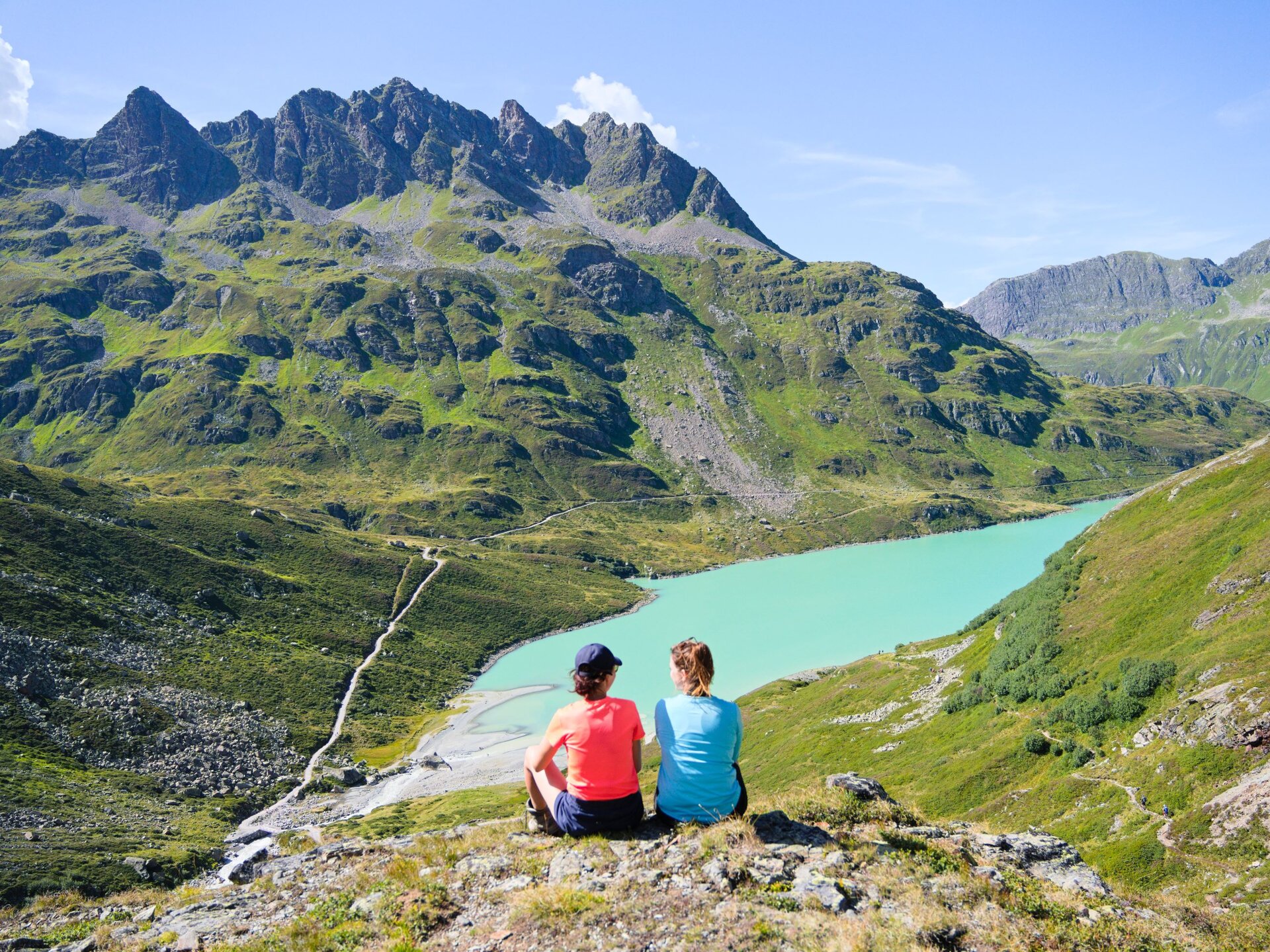 Am türkisblauen Silvrettasee hält der Bus. Der 1,31 km² große Stausee liegt auf einer Seehöhe von 2.030 m auf dem ehemaligen Ochsenboden, einer Senke der Silvretta. Am nördlichen Ufer treffen wir die Bergwanderführerin Catharina und die kleine Gruppe, mit der wir heute auf dem Hohes Rad Rundweg unterwegs sind. Catharina zeigt uns, wo es hingeht. Am südöstlichen Ufer thront das Hohe Rad hoch über die Seeoberfläche. „Wir wandern durch das Bieltal an der östlichen Seite hinauf zum Radsattel. Da machen wir eine längere Pause“ fängt sie an, „Danach geht es runter zur Wiesbadener Hütte und durch das Ochsental an der anderen Seite vom Berg wieder zurück zum See.“ Klingt nach einem guten Plan, also los geht’s!