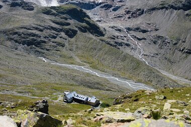 Die Wiesbadener Hütte lockt: Abstieg mit dem Piz Buin im Blick