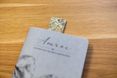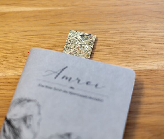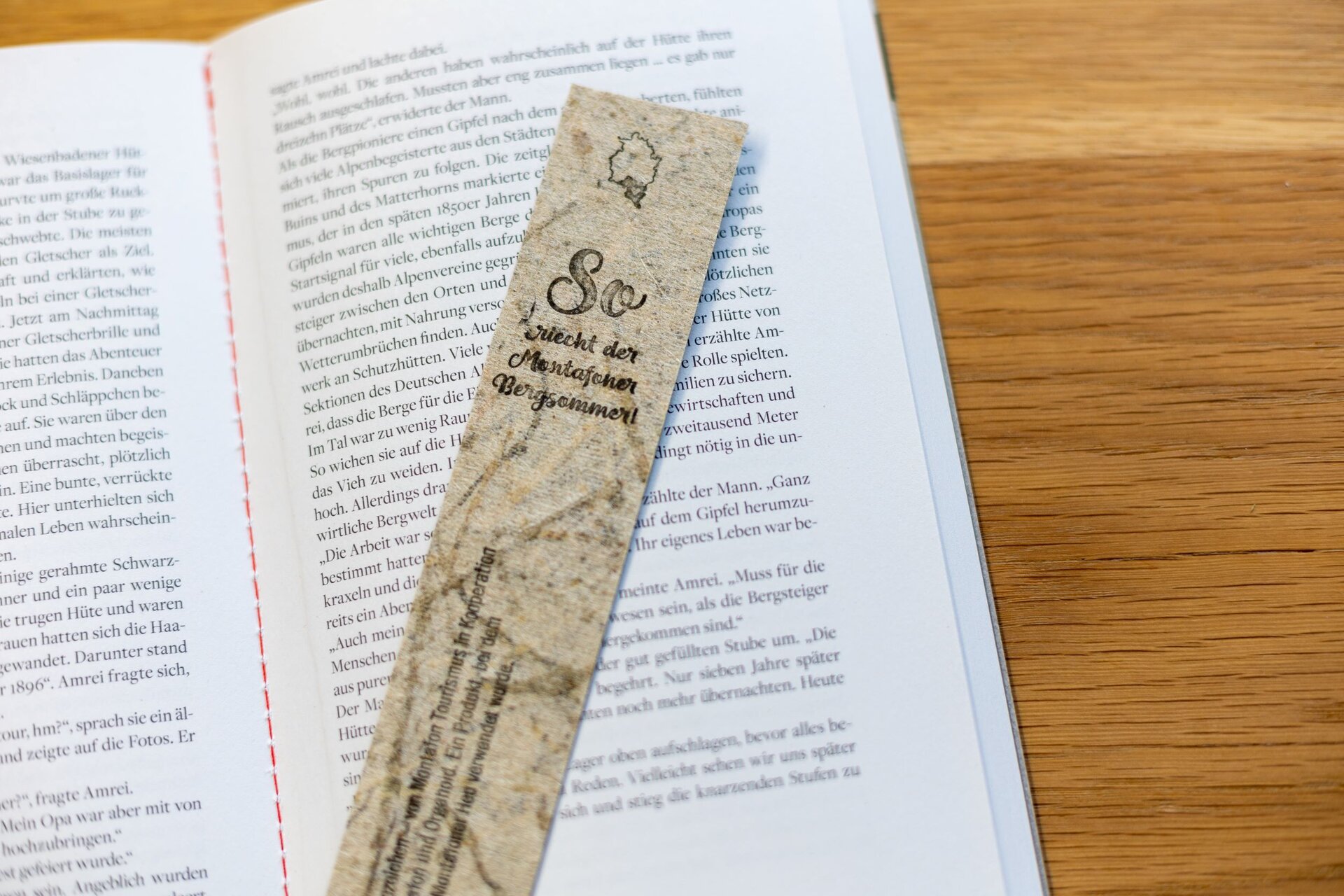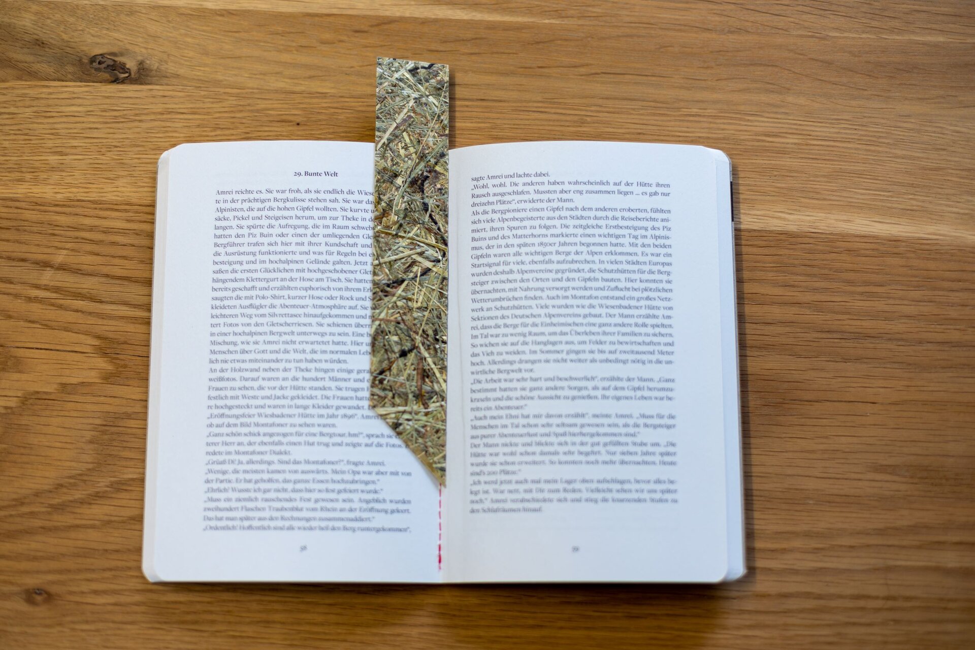 Das Heu dazu wurde durch den Verein bewusst.montafon, der für die Zusammenarbeit von regionalen Genussproduzenten, der Gastronomie und dem Handel im Montafon steht, bereitgestellt. „Der Transport und besonders das Häckseln des Heus in der gewünschten Form, damit es die Druckerei im Anschluss optimal pressen konnte, war eine ungewöhnliche, aber auch spannende Aufgabe“, erzählt Oswald Ganahl, Obmann von bewusst.montafon. „Die Idee hat mich von Beginn an begeistert. Ein solch herrlich duftendes Erinnerungsstück aus dem Montafon ist schließlich etwas Einzigartiges.“ Mit der Druckerei Thurnher in Rankweil war auch ein Partner in Vorarlberg gefunden, der die Herausforderung der Herstellung des Lesezeichens aus Montafoner Heu perfekt umsetzte.