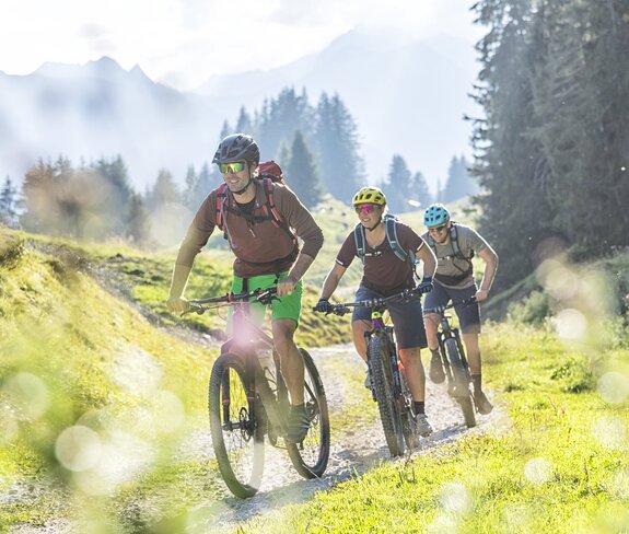Eine verblockte ausgewaschene Querung im Singletrail bringt auch die besten Biker unter uns an ihre Grenzen. Wir steigen ab und schieben eine kurze Passage. Doch die Mühe lohnt sich: Am Scheitelpunkt des Trails, bevor er sich flowig in Richtung Tal schlängelt, genießen wir nochmals einen traumhaften Blick ins Klostertal. Wir senken den Sattel etwas ab für mehr Kontrolle auf dem Bike und begeben uns in Richtung Tal. Jeder fährt den Singletrail in seinem individuellen Tempo. Bei gelegentlichen Pausen, um die Handgelenke zu entlasten, kommen die Gäste aus dem Schwärmen nicht mehr raus. Nach dem letzten Teilstück des Single Trails fahren wir vorbei am traumhaft gelegenen Fritzensee zurück ins Tal. Alle Gäste sind glücklich und der Meinung, dass sie nach solch einem Tag mit Sicherheit gut schlafen werden. Ich hingegen bin glücklich darüber, dass ich alle Gäste wieder gesund zurück ins Tal begleitet habe. Mein persönliches Tagesziel habe ich erfüllt. Nachdem ich mein Mountainbike für den nächsten Tag auf Vordermann gebracht habe, merke auch ich, dass ich nach solch einem Tag gut schlafen werde. Ich gehe früh ins Bett, denn schon am nächsten Morgen steht für mich die nächste Tour auf dem Programm.