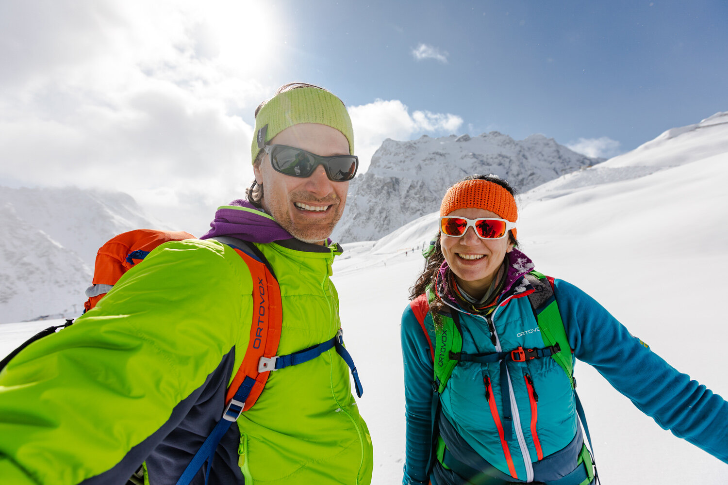 Dreht man sich um, kann man gut die mächtigen Drei Türme und die Sulzfluh erkennen. Eine so schöne Winterlandschaft, da vergisst man doch glatt die Anstrengung des Aufstiegs. Trotzdem waren wir natürlich froh, als wir am Madrisajoch – unserem Tourenziel auf etwa 2.600 Meter – ankamen und uns endlich unserer Jause widmen konnten.