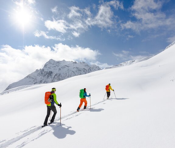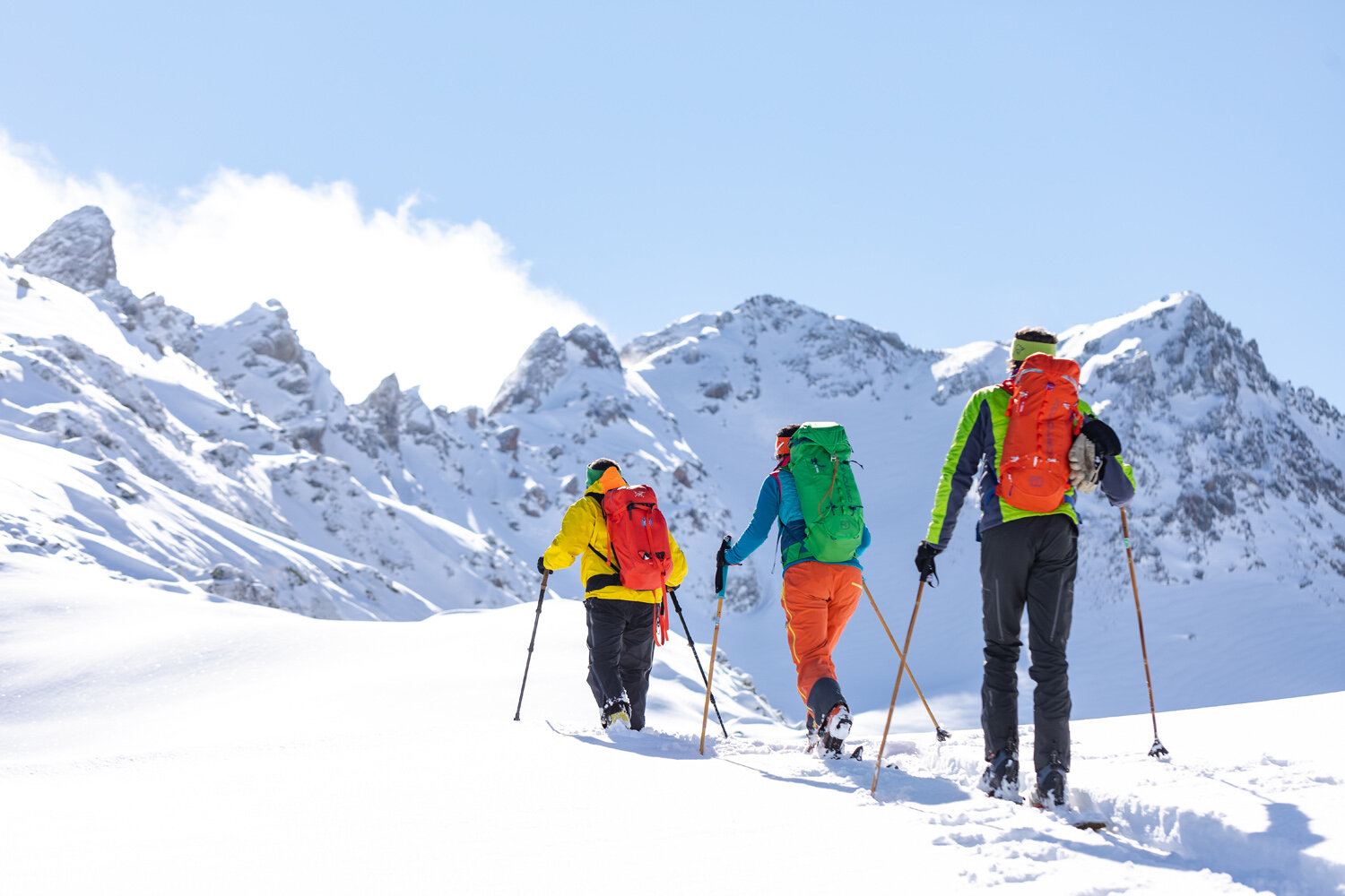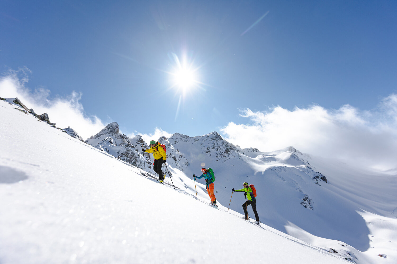 Nach dem obligatorischen LVS-Check führte Berg- und Skiführer Hanno unsere kleine Truppe an und zog sicher eine frische Spur hinauf zum Gafierjoch auf 2.415 Meter. Von dort an begleitete uns eine phantastische Aussicht über das Schweizer Prättigau auf die Rätschenfluh und das Madrisahorn, die uns immer wieder zum Staunen brachte.