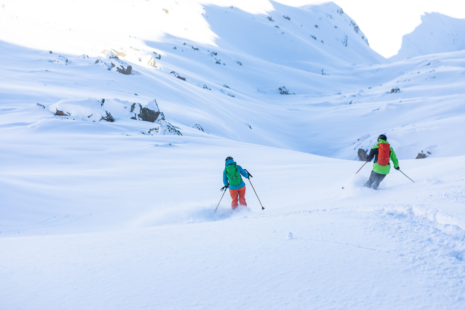 Die gesamte unverspurte Pracht des Gandatals lag vor uns. Im herrlichsten lockeren Pulverschnee zogen wir unsere Kurven über sanft kupierte Hänge bis hinab ins Valzifenztal.