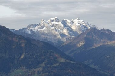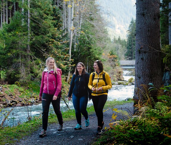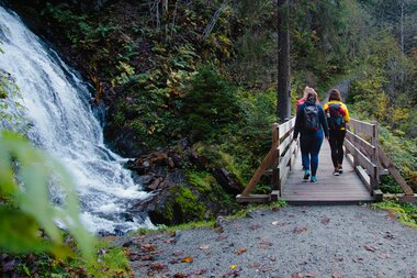 Entlang des Baches und bunt gefärbten Büschen und Bäumen laufen wir weiter in Richtung hinteres Silbertal. Dabei ist das tosende Wasser nun unser steter Begleiter. Vorbei an einem kleinen Wasserfall und dem imposanten Berggipfel entscheiden wir uns dazu, beim Hasahüsli einzukehren und die Aussicht noch etwas zu genießen. Von dort aus laufen wir noch ca. eine Stunde der Litz entlang durch farbenfrohe Wälder zum Parkplatz bei der Talstation der Kristbergbahn.