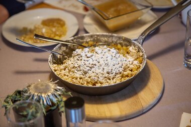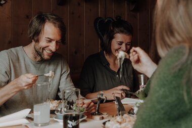 Dieser Moment, das Herz klopft, die Mundwinkel ziehen sich nach oben und der Bauch kribbelt. Als Isabella uns die erste Pfanne Keesknöpli serviert, strahlen die Gesichter am Tisch. Es gibt nichts schöneres als ein deftiges Abendessen nach einem kunterbunten Herbstwandertag. Und das leckere Bergfrühstück ist ja auch schon eine ganze weile her 😉.