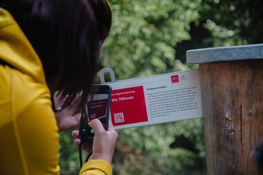 Wie der Name es bereits erahnen lässt, lernen wir entlang des Sagenwanderweges einige der hier verorteten Sagen des Montafon kennen. Dabei markieren hölzernen Stehlen zehn sagenhafte Schauplätze und geben mithilfe ausklappbarer Schilder einiges Interessantes über die Geschehnisse preis. Wer will, kann über einen QR-Code noch mehr zur jeweiligen Sage und dem Ort erfahren. Der Sagenwanderweg führt an der St. Agatha Kapelle hinauf zum Kristbergsattel und weiter zum Bruderhüsli.