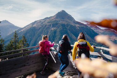 Danach laufen wir den Wanderweg entlang, bis wir beim Aussichtspunkt Wildried angelangt sind. Eine echte Rarität im Alpenraum! Das im Herbst in leuchtende Orange-, Rot-Töne getauchte Wildried ist das höchstgelegene Hochmoor Europas und beherbergt aufgrund seiner Zusammensetzung eine Vielzahl an seltenen Pflanzen- und Tierarten. Um dieses sensible Ökosystem nicht zu zerstören, ist es wichtig, auf dem Wanderweg zu bleiben – auch wenn die große Wiesenfläche fast schon dazu einlädt, sich in Mitten der herbstlichen Farbenpracht nieder zu lassen.