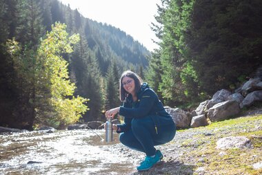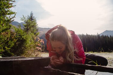 Beim Burtschabach haben wir einen idealen Jausenplatz gefunden. Direkt am plätschernden Bach füllen wir unsere Trinkflaschen wieder auf und genießen gemeinsam unsere Jause. Keine Sorge, das Wasser im Montafon hat Trinkwasserqualität, auch eine heilende Kraft wurde ihm zugesagt. Im 17. Jahrhundert kamen Menschen von Nah und Fern um ihre Leiden hier in den Quellen in Silbertal auszukurieren. Auch heute noch sind die Quellen ein wichtiger Treffpunkt für die Silbertaler Bevölkerung.