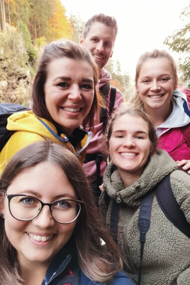 Noch kurz einen Schluck vom eiskalten Bergwasser trinken und dann geht’s auch schon weiter für uns in den bunten Blätterwald. Es riecht immer noch leicht nach Regen, jetzt mischt sich der Duft jedoch mit etwas Würzigem.