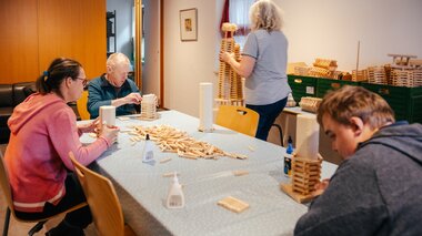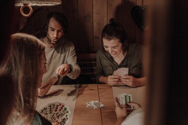 Gut gestärkt mache ich mich jetzt bereit für den Jass. Ich bin nämlich keine gute Jasserin, musst Du wissen. Das traditionelle Kartenspiel wird in ganz Vorarlberg gespielt und hat verschiedene Spielvarianten wie Kreuzjass oder Bodenseejass. Mir gegenüber sitzt Franziska – ein echter Profi, wenn es ums Jassen geht. Von ihr habe ich noch so einige Tipps mitbekommen und auch Max hat sich noch zu uns dazu gesellt für einen „ghörigen Jass“.