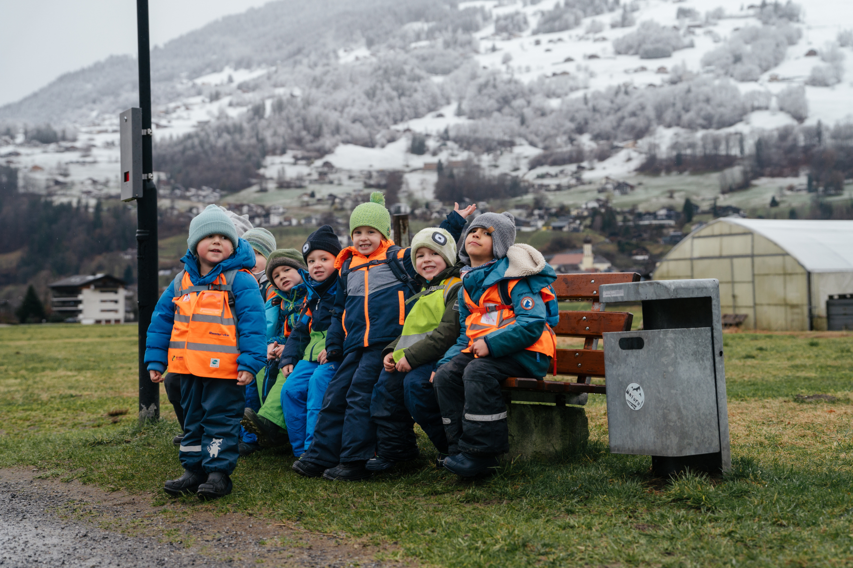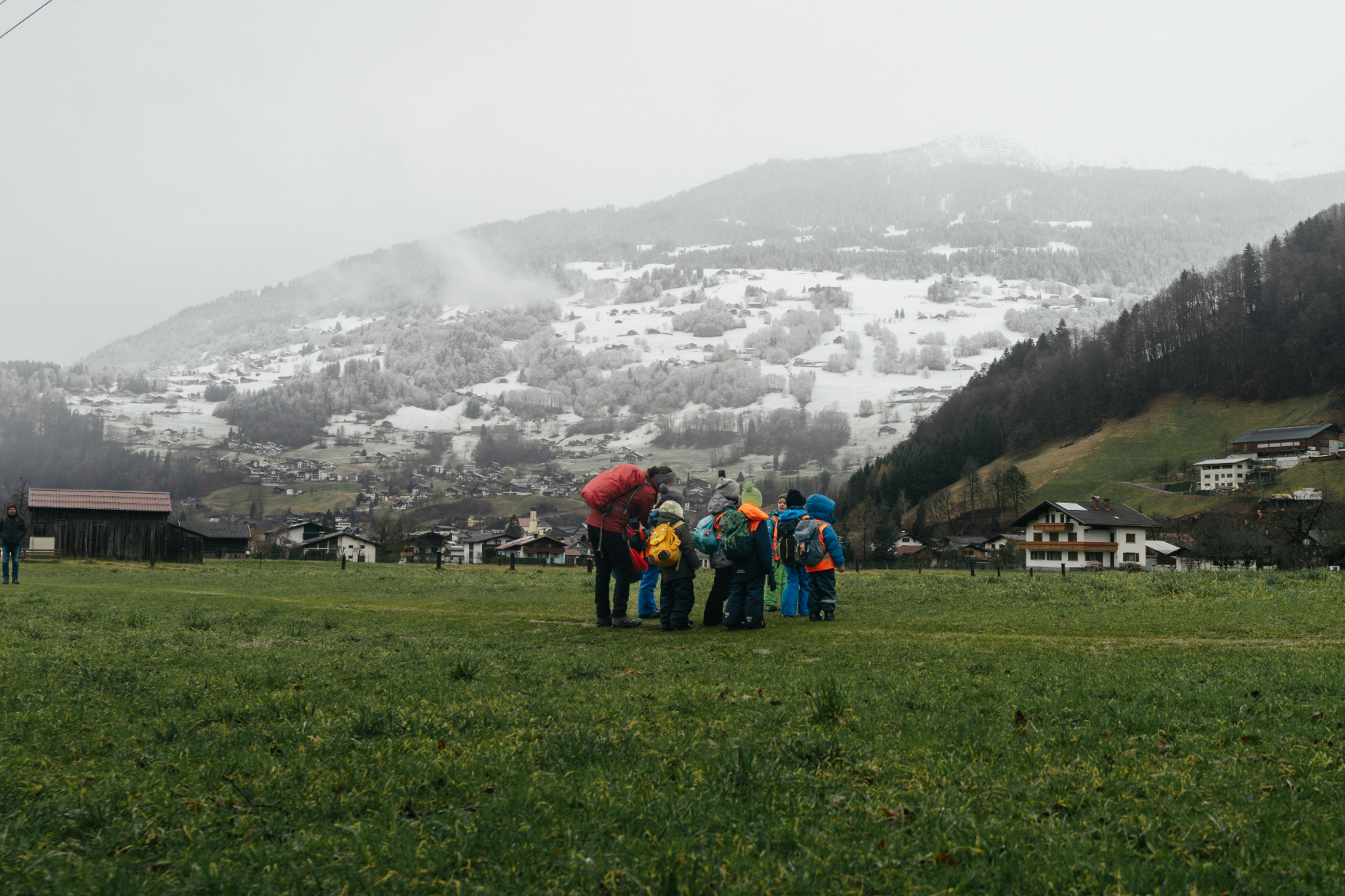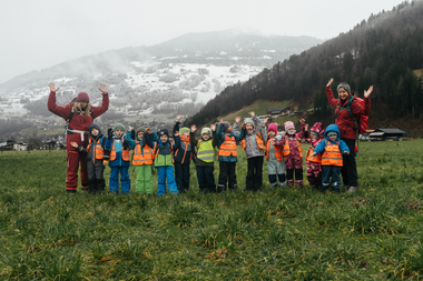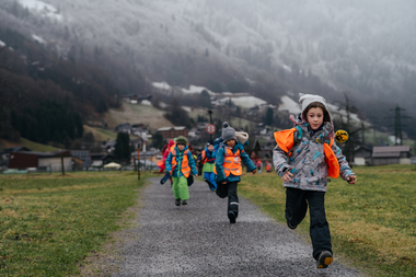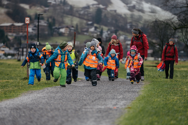 Da der Bus zurück nach Bartholomäberg noch auf sich warten ließ, wurde schnell umentschieden. Zu Fuß stapften die Kinder übers „Feld" (den Feldweg in Schruns entlang) zur nächsten Bushaltestelle. Auch dieser Weg hielt kleine Abenteuer bereit. Sie waren fasziniert, als sie von hier aus auf den Bartholomäberg sahen. Felix: „Da oben ist mein Kindergarten und er steht im Schnee." In Schruns war der Schnee bereits geschmolzen. So konnten die Kinder über grüne Wiesen rennen.