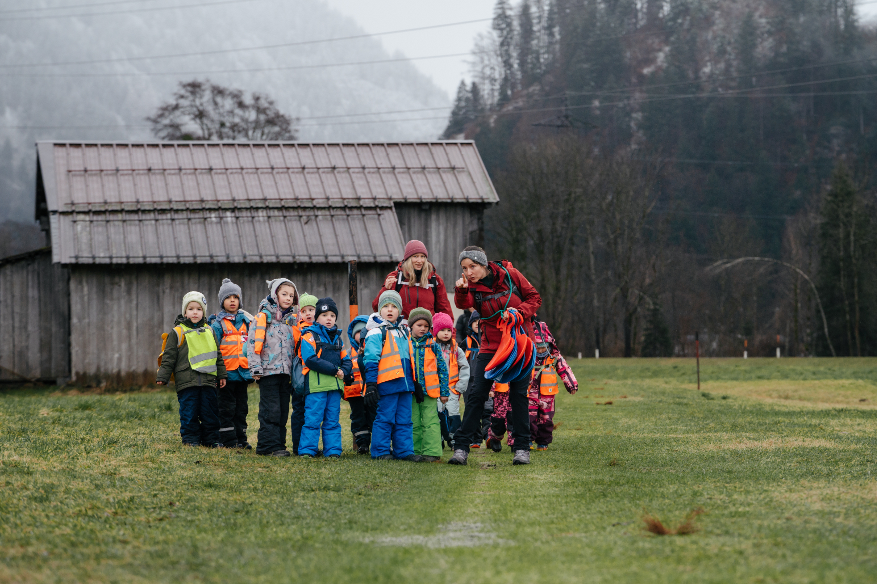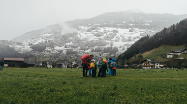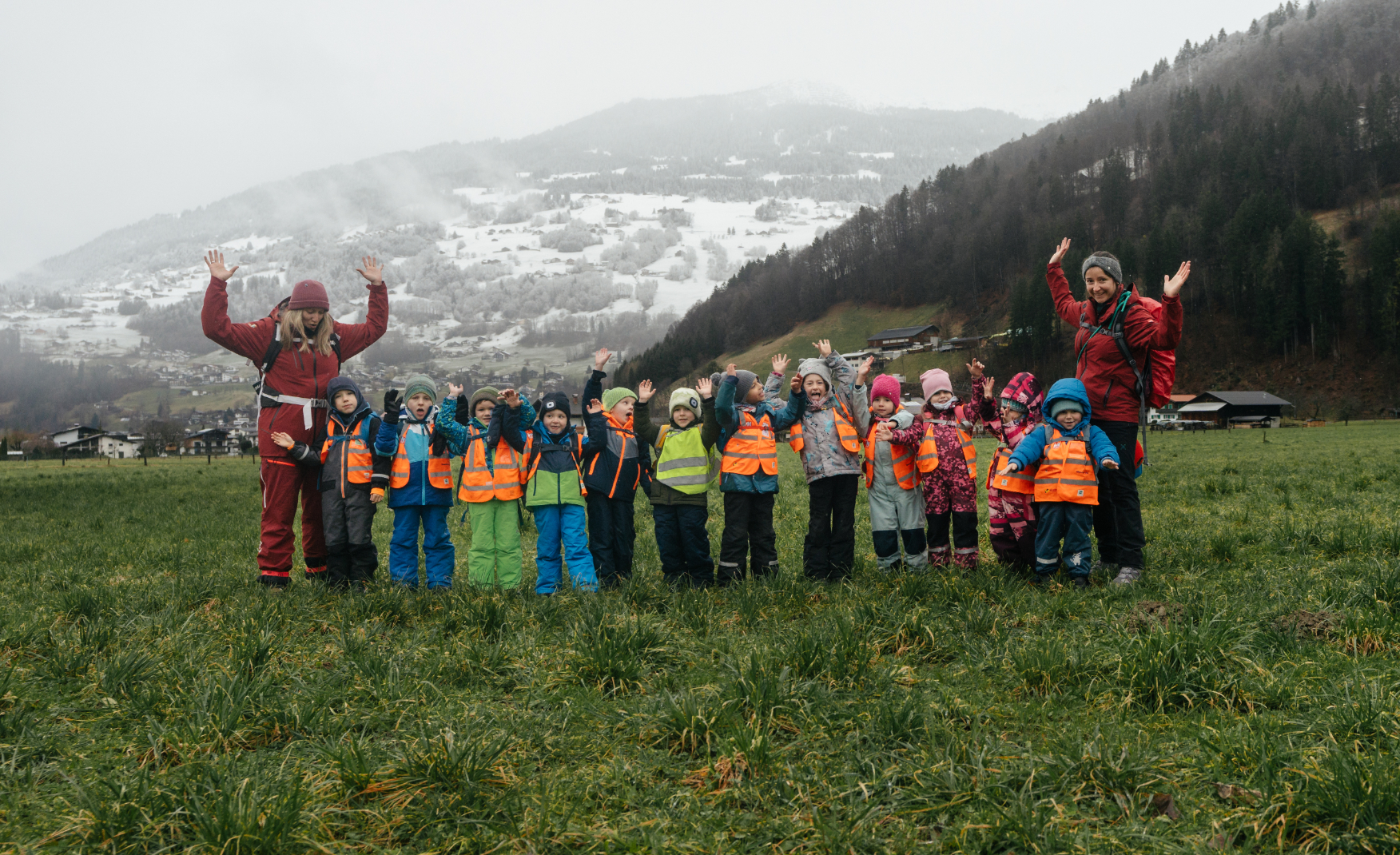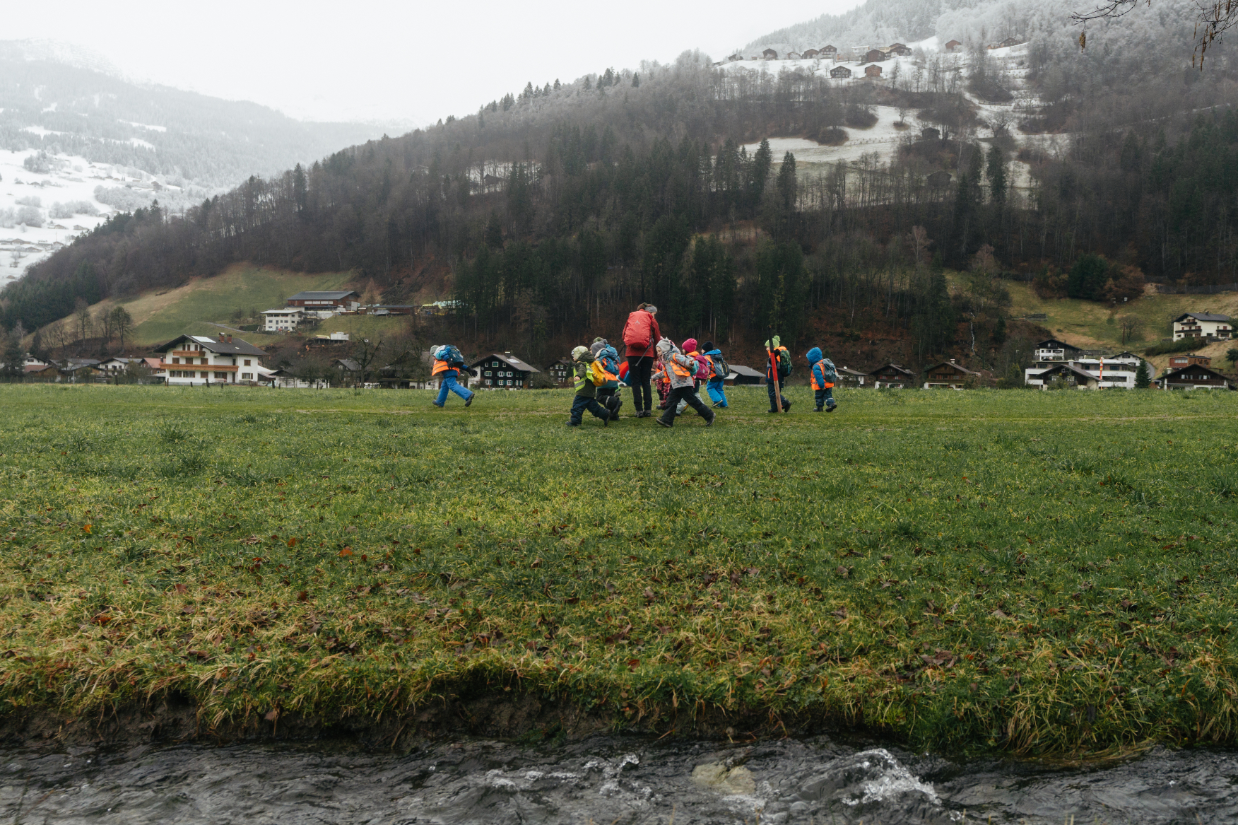 Da der Bus zurück nach Bartholomäberg noch auf sich warten ließ, wurde schnell umentschieden. Zu Fuß stapften die Kinder übers „Feld" (den Feldweg in Schruns entlang) zur nächsten Bushaltestelle. Auch dieser Weg hielt kleine Abenteuer bereit. Sie waren fasziniert, als sie von hier aus auf den Bartholomäberg sahen. Felix: „Da oben ist mein Kindergarten und er steht im Schnee." In Schruns war der Schnee bereits geschmolzen. So konnten die Kinder über grüne Wiesen rennen.