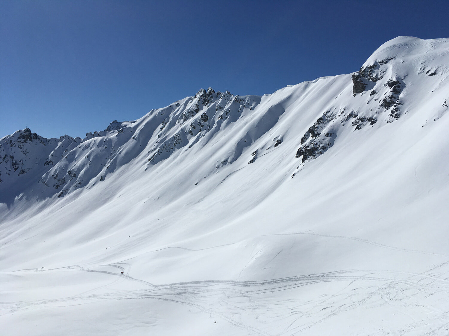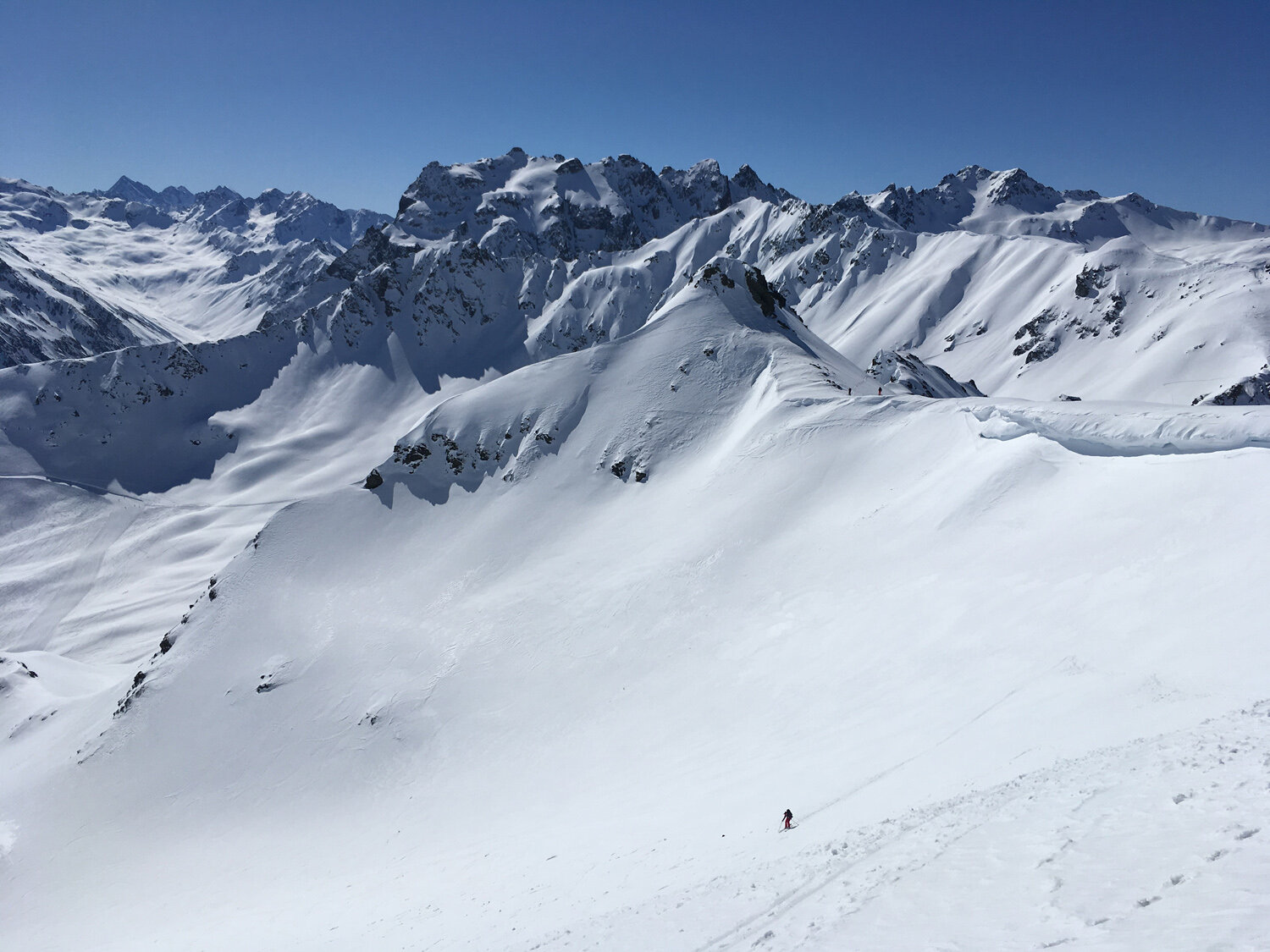 Mit Blick auf die Uhr beschlossen wir daraufhin jedoch das Gipfelkreuz auszulassen und lieber auf einen anderen Tag zu verschieben. Doch selbst vom Riedkopfjoch aus hatten wir einen guten Blick auf ein paar der mächtigen Rätikon Gipfel wie z.B. Wiss Platte, Sulzfluh und Drei Türme. Und natürlich auf die erste lange Abfahrt des Tages: gute 700 Höhenmeter und 4 Kilometer hinunter Richtung Partnunstafel.