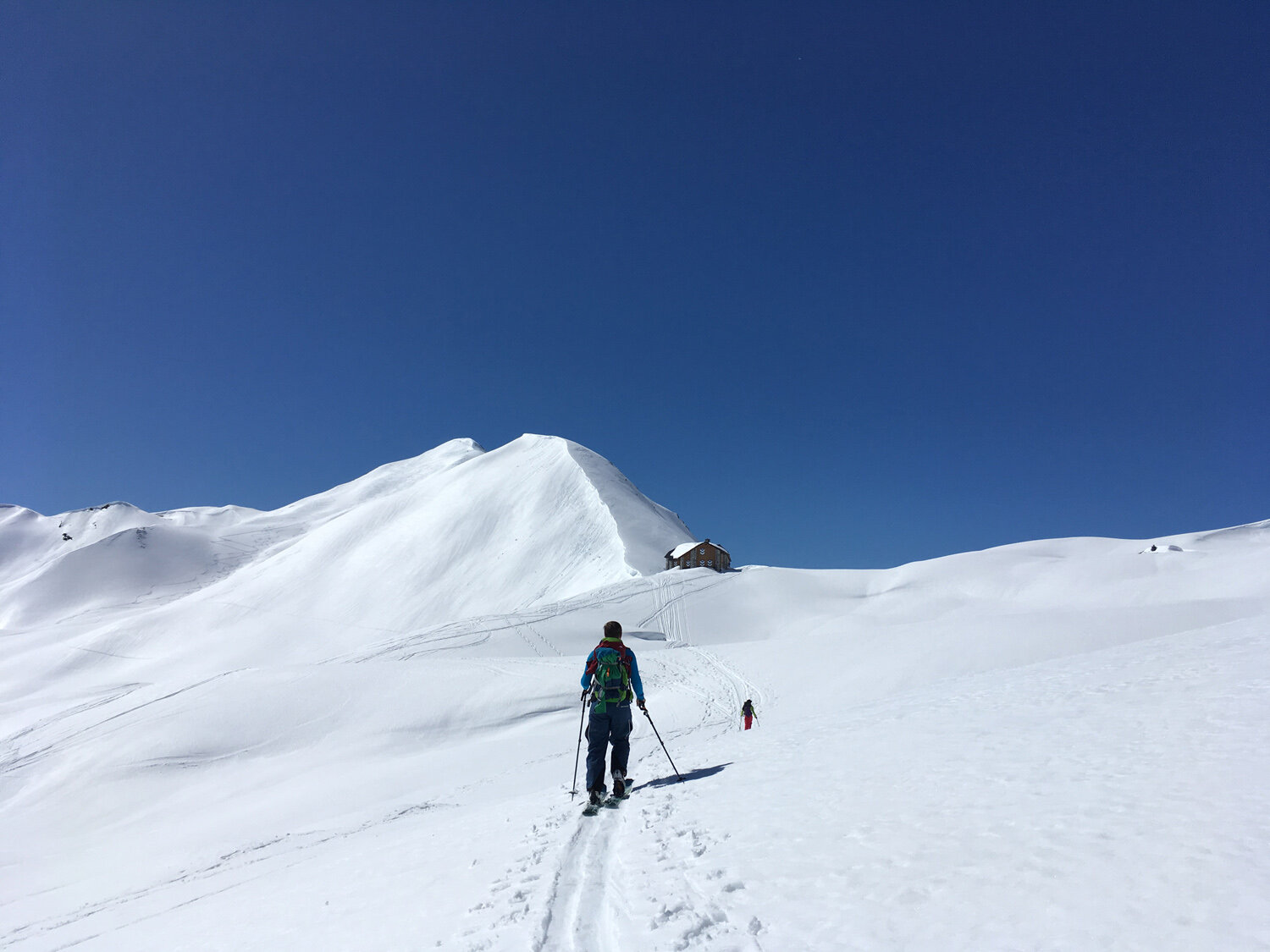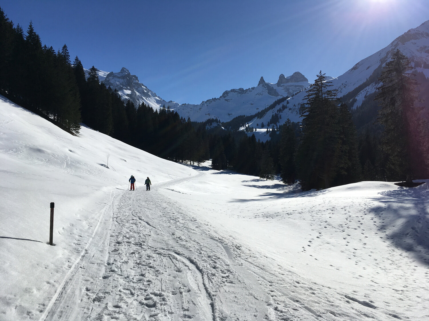 Danach folgten wir den langen, sanft kupierten Hängen (je nach Himmelsrichtung pulvriger bis knuspriger Schnee) und dem Talboden in westliche Richtung. Um keine Höhenmeter zu verlieren, traversierten wir auf der rechten Teilseite oberhalb von Partnun mit seinen tief verschneiten Dächern bis zum Berghaus Alpenrösli. Deren verlockende Terrasse mussten wir sprichwörtlich links liegen lassen.