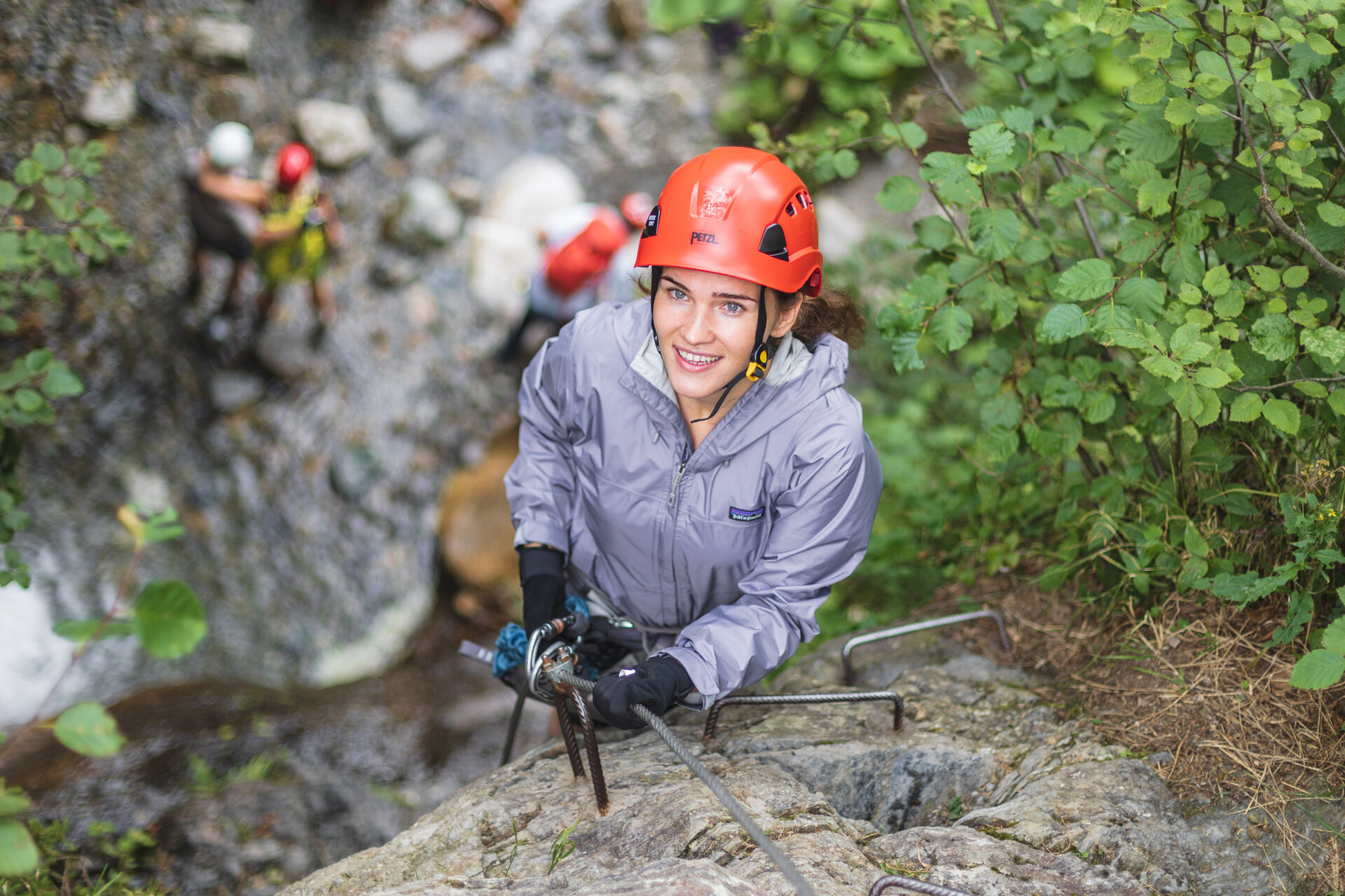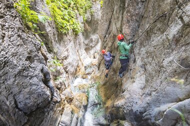 Der relativ kurze Zustieg befindet sich taleinwärts rechts am Ortsanfang. Es empfiehlt sich, die Ausrüstung an einer flachen Stelle vor dem Einstieg anzulegen, denn danach wird es eng und steinig, aber schön. Dafür sorgt allein schon der Wasserfall, der die Kletterer bis zum Ausstieg begleitet. An heißen Tagen versprüht er zudem angenehme Kühle. Die Tritte sind in gut zu bewältigenden Abständen angebracht. Dennoch heißt es aufpassen, weil sie zu jeder Zeit feucht und damit rutschig sein können. Ebenfalls zu beachten ist der Wasserstand des Baches. Der kann nach einem Gewitter ganz schnell ganz schön hoch sein.