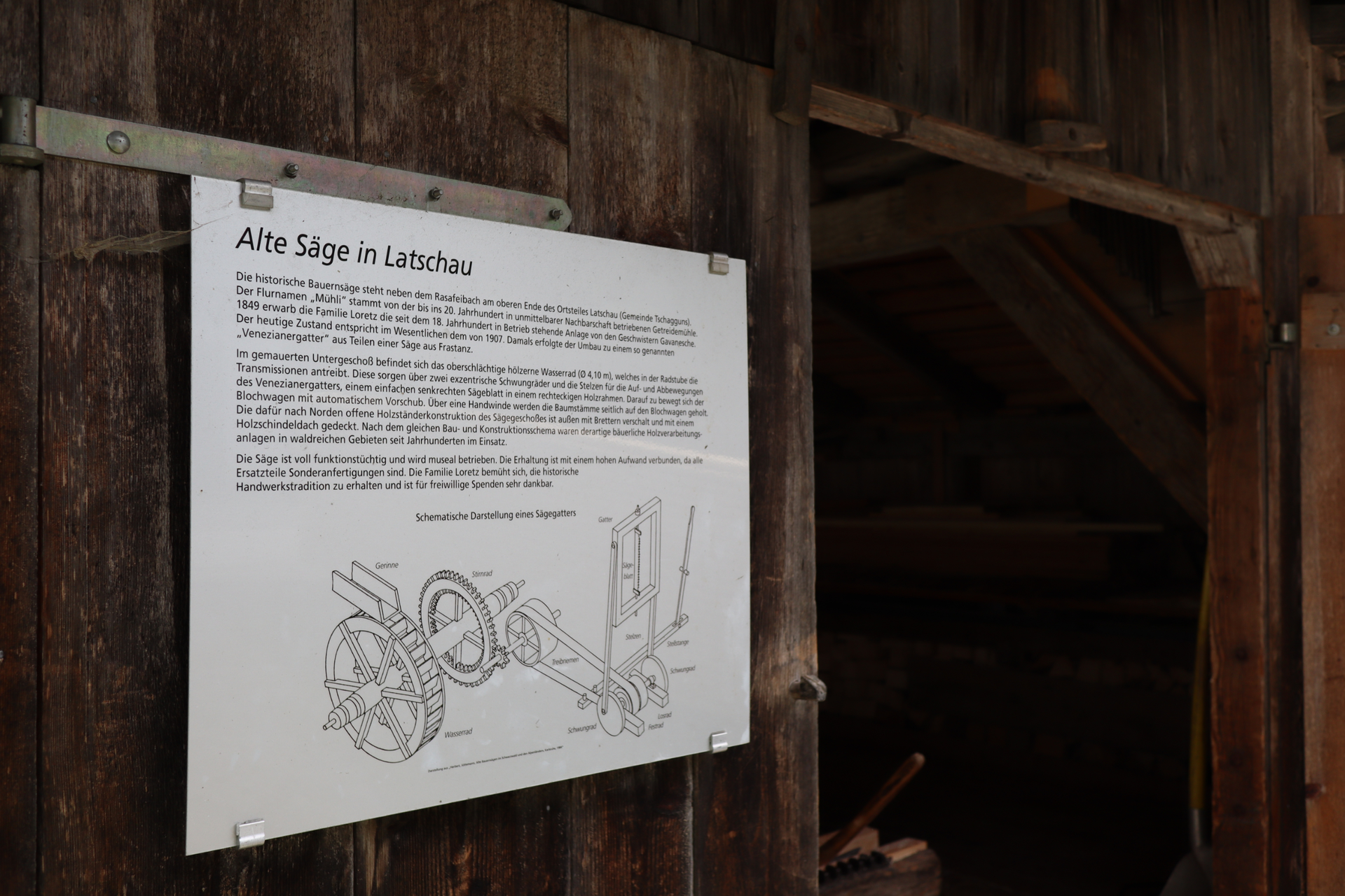 Die seit dem 18. Jahrhundert betriebene Säge steht am Rasafeibach in Latschau und ist nach dem Flurnamen „Mülli“ und dem früheren Besitzer Ferdinand Loretz benannt. Ein besonderer Ort, um alles über das einzige aktive mit Wasser betriebene Sägewerk Vorarlbergs zu erfahren. Dass ein Holzsägewerk alles andere als „langweilig“ sein muss, beweist Dir Hubert mit seinen interessanten Erzählungen und dem riesigen hölzernen Wasserrad im Untergeschoss des Sägewerkes. Die Schausäge „Mülli-Ferdi“ zeigt die Vielfalt der Holzverarbeitung und die damit verbundene Geschichte und Gegenwart der Familie Loretz, welche den Erhalt dieser besonderen mit Wasserkraft betriebenen Säge seit jeher sichert.