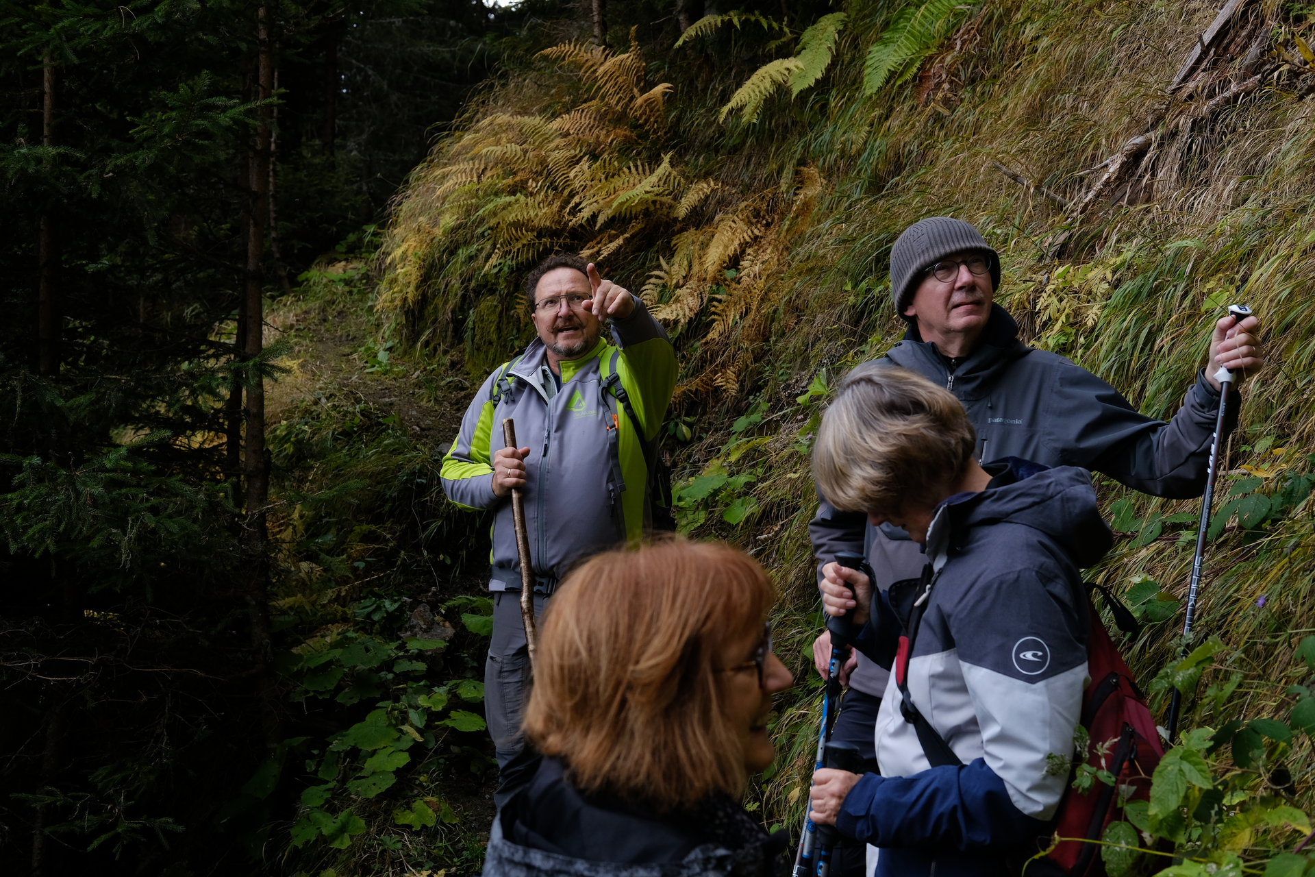 Ein weiters Thema der Wanderung war der Klimawandel und seine Auswirkungen auf die Wälder im Montafon. Alexander wies auf sichtbare Veränderungen hin, die er in den letzten 30 Jahren beobachtet hat: „Es wird wärmer, es schneit später und Pflanzen, die früher in tieferen Lagen wuchsen, finden sich jetzt auf höheren Ebenen.“ Der Wald als Schutzschild gegen Lawinen und Steinschlag ist dadurch stärker unter Druck geraten.