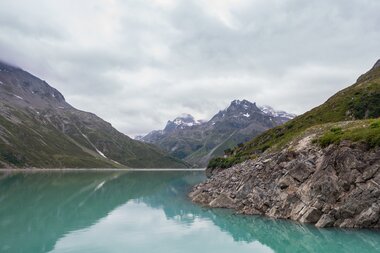 Wir biegen nicht ab, sondern spazieren weiter den Uferweg entlang und blicken nun Richtung Silvretta-Bielerhöhe. Dort sehen wir in weiter Ferne unseren Ausgangspunkt und halten inne. Der zweistündige Rundweg um den Stausee mit seinen sanften Anstiegen und den gut angelegten Pfaden bietet Schritt für Tritt viele Gelegenheiten, das alpine Paradies zu bestaunen.