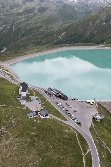Die ersten Schritte auf dem Silvrettasee Rundweg wecken bereits sämtliche Sinne und führen uns beim Restaurant Silvrettasee vorbei. Wer motorisiert anreist, kann sein Auto auf der Bielerhöhe übrigens auf den vielen Parkplätzen entspannt abstellen. Hier, hoch oben auf 2.032 Metern Seehöhe direkt am Ufer des Stausees, kann ich mir gut vorstellen, dass Schnitzel, Burger und Torten besonders munden.