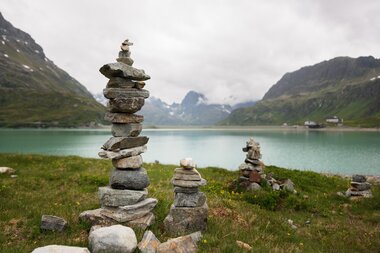 Nach ein paar tiefen Atemzügen treten wir die letzte Etappe an und erspähen nicht nur den Berggasthof Piz Buin und das Silvretta-Haus, sondern entdecken auch eine romantische Blumenpracht mit Enzian und Alpenrosen in leuchtenden Farben. Schnell noch ein Foto davon gemacht, bevor wir die Bielerspitze und die beeindruckende Vallüla vor die Augen und Handykameras bekommen und erneut den Auslöser drücken. Der Silvrettaseedamm ziert letztendlich die finalen Meter unserer Seerunde und wir knipsen die allerletzten Fotos der lustigen Steinmännchen, die wie ein Willkommenspublikum beim Ziel auf uns warten.