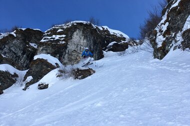 Hierzu müssen wir den Einstieg nicht lange suchen, denn Teile der Abfahrt sieht man schon vom Aufstieg aus. Je nachdem wie die Schneelage es zulässt, fahren wir vom Gipfel erst ein paar Meter zurück in östliche Richtung (entlang der steilen Aufstiegsspur), um dann in die breiten Hänge Richtung Nord-Osten einzufahren. Oft findet sich hier auch ein paar Tage nach dem letzten Schneefall noch Pulver. An der nächsten Geländekante überlegen wir, welchen Weg wir für die Steilstufe am Ende wählen. Weiter links ist die Ausfahrt zwischen den Felsen breiter, bei schlechter Schneelage jedoch sehr mit Büschen durchsetzt. Weiter rechts geht es durch eine Art Rinne weiter, aber die bekommt manchmal etwas Sonne ab. Dieses Jahr ist das keine Frage, wir haben mehr als genug Schnee, also links. Ein paar Schwünge später werden wir noch mal mit einem breiten Tiefschneehang verwöhnt, der wie die Rinne im Novatal auf die Schwarzköpfle Route trifft.