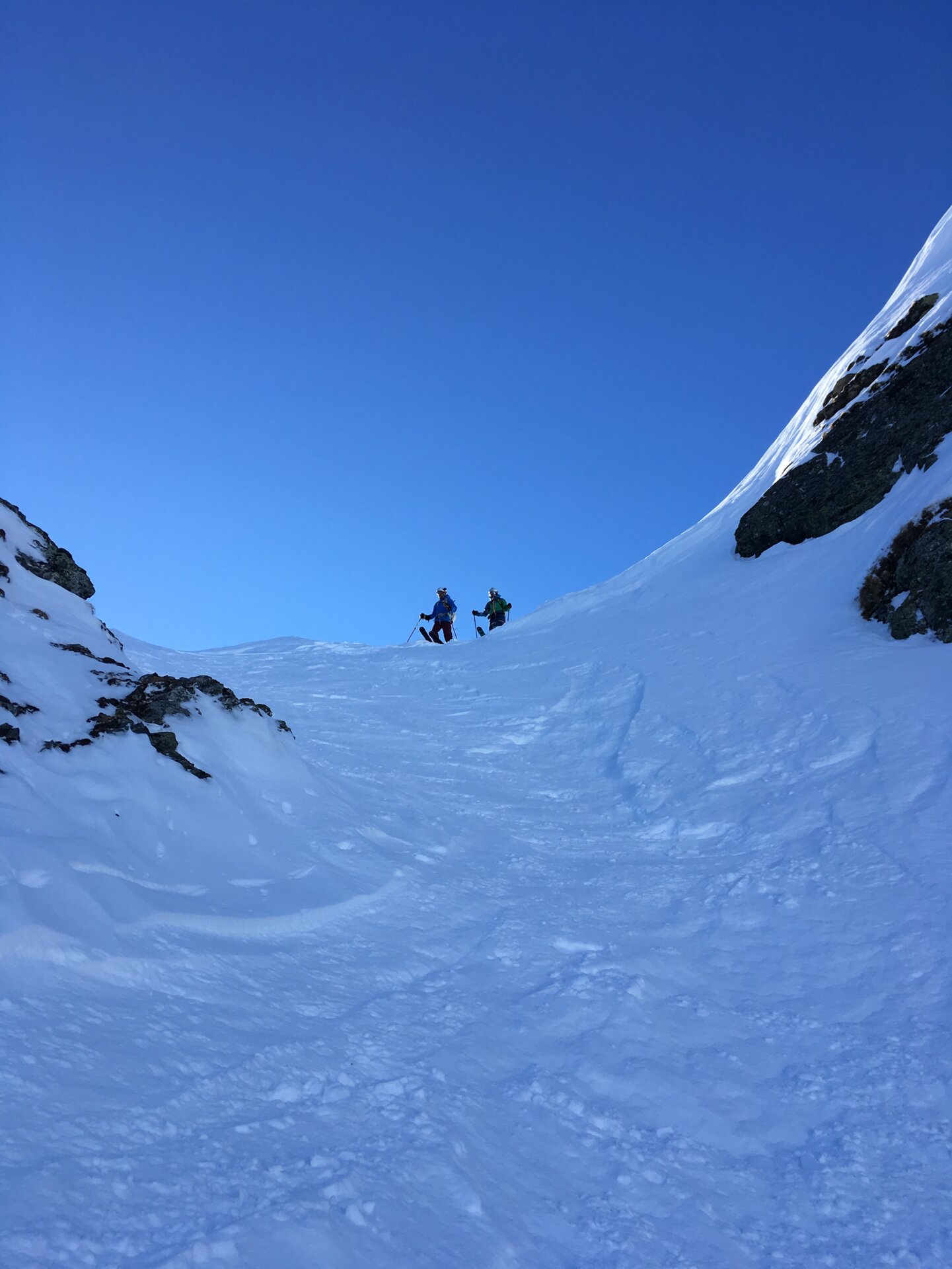 Noch ist es hier kalt und schattig, aber die wärmende Sonne ist nur wenige Schritte entfernt. Also verstauen wir auch unsere Jacken im Rucksack. Einen LVS Check später ziehen wir in Richtung der Lawinengalerie auf der rechten Seite los, dann um die „Ecke“, wo die Sonne schon auf uns wartet. Nach ein paar Minuten erreichen wir eine Wechte in der Einsattelung, die je nach Winter mehr oder weniger ausgebildet ist. Ab hier halten wir uns links und überwinden eine längere Steilstufe mit ein paar Spitzkehren. Bei frischem Schnee kommt man auch mal ohne aus. Dabei behalten wir unsere Umgebung gut im Blick, denn nicht selten kann man hier Gämse und Steinböcke in ihrer natürlichen Umgebung beobachten.