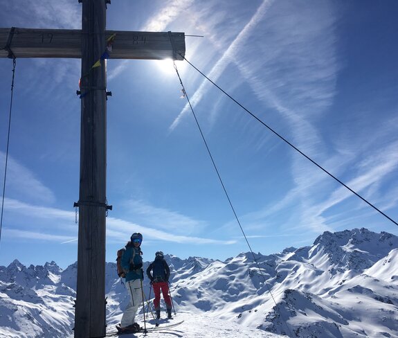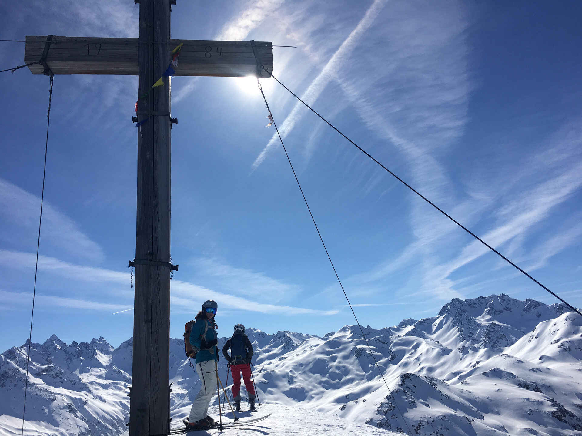 Oben angekommen gibt es erstmal eine leckere Jause mit Sura Kees Pistenbrot und Bergkräuter Tee. Den Gipfelschnaps lassen wir ehrlich gesagt weg, aber wer ihn mag, darf sich am Kreuz natürlich ein Schlückchen gönnen. Wir nutzen die Pause und inspizieren die verschiedenen Abfahrtsvarianten zwischen denen wir uns entscheiden müssen: nord-westlich ab durch die Mulde (>35 Grad steil), süd-westlich im großen Bogen (super bei Firn, >30 Grad steil) und nördlich die Direttissima durch eine Rinne (>40 Grad steil, verlangt absolut sichere Bedingungen und verzeiht keine Fehler). Alle drei enden mehr oder weniger am Nova Lift im Novatal. Wir sind sie alle schon mehrfach gefahren und natürlich favorisieren wir schon vor Tourbeginn eine Abfahrt, aber manchmal ändern sich die Bedingungen unterwegs oder das Bauchgefühl und wir entscheiden uns um, gehen eventuell einen Schritt zurück.