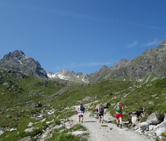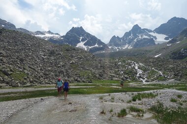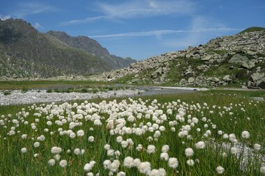Auf der Ebene unterhalb der Saarbrücker Hütte gibt es einen wunderschönen Platz mit einem mäandernden Bächlein und einem großen Wollgrasfeld. Dort leite ich eine Naturmeditation an, bei der wir bewusst alle Elemente spüren und uns bei der Natur bedanken.