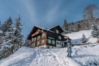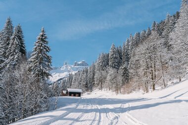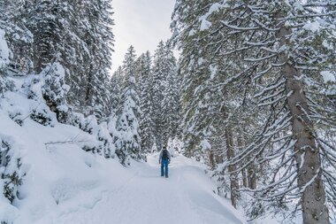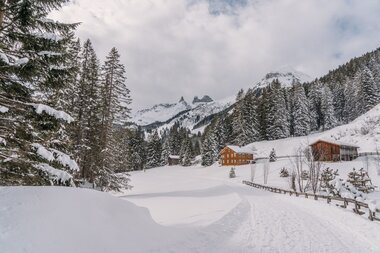 Wir starten unsere Tour in Latschau. Die Sonne scheint herrlich vom blauen Himmel und wir kommen uns vor, wie im Winterwunderland. Der Schnee liegt dick auf den Bäumen und die Luft ist frisch und klar. Ein Traumtag, um die etwa sieben Kilometer zur Lindauer Hütte zu wandern.