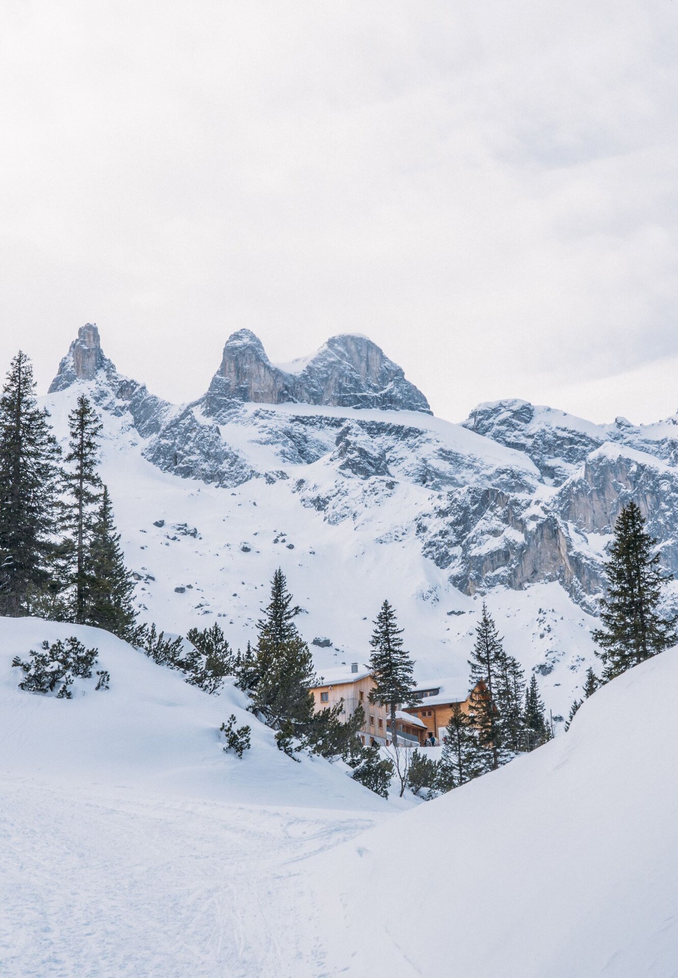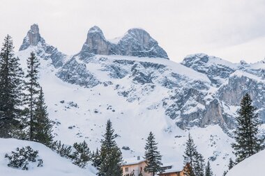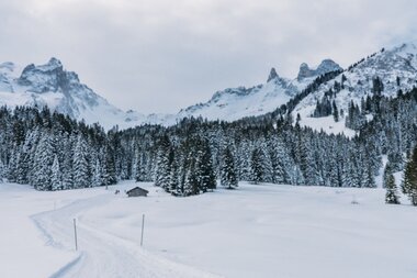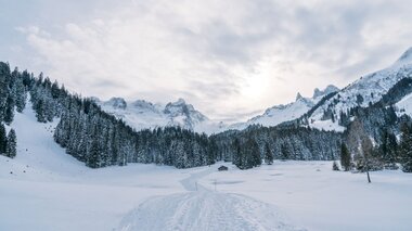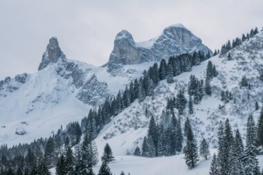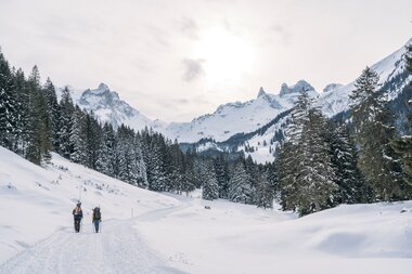 Der Weg ist gut präpariert und unsere Wanderschuhe reichen vollkommen aus. Extra Equipment ist also nicht notwendig, um diese Wanderung zu machen. Wir halten immer wieder an und genießen die Winterlandschaft und die Stille um uns herum. Am Ende des Tals sieht man schon die markanten „Drei Türme“. Man könnte meinen sie sind ganz nah dran, aber es dauert um die zwei Stunden bis wir endlich an der Lindauer Hütte angekommen sind. Unterwegs treffen wir immer wieder auf Skitourengeher und andere Wanderer. Die Stimmung ist gut, auch als das Wetter umschlägt und die Sonne sich bald hinter dicken Wolken versteckt.