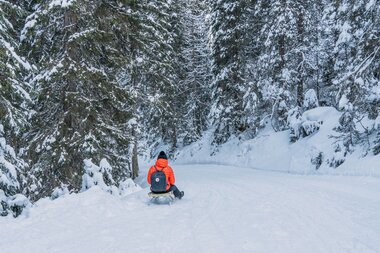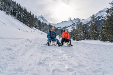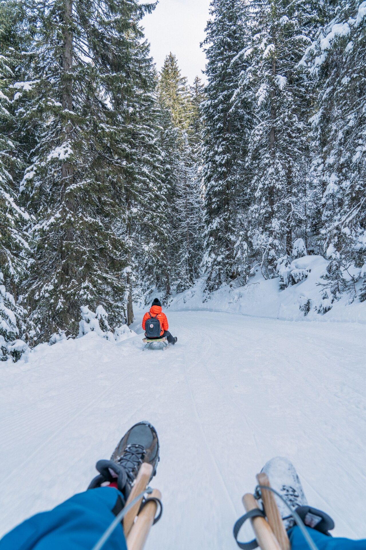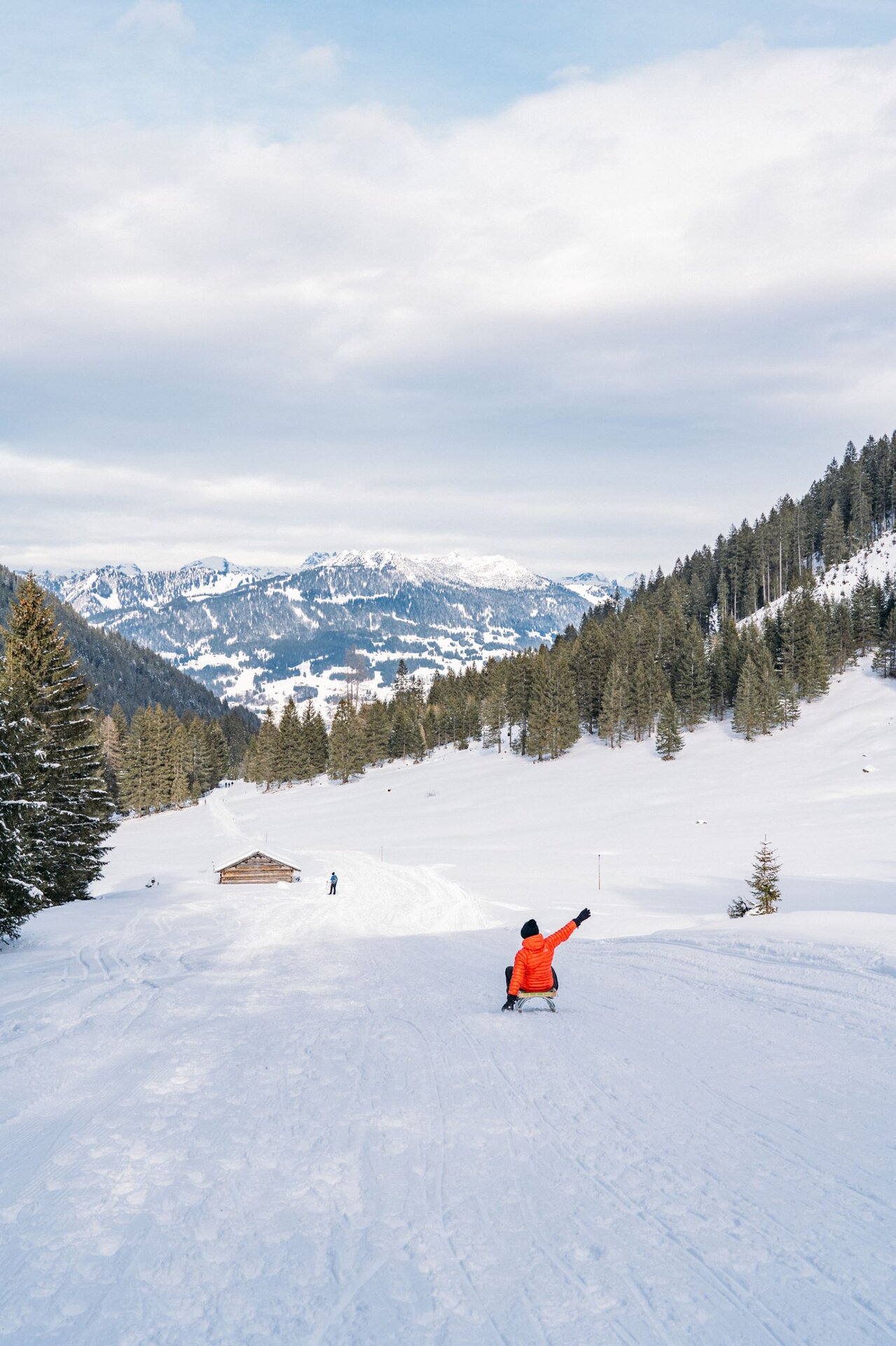 Nach der ausgiebigen Pause leihen wir uns zwei Rodel von der Lindauer Hütte und rodeln das gesamte Gauertal zurück nach Latschau. Die Strecke ist nie wirklich steil und deswegen ist die Tour auch als Familie absolut empfehlenswert.