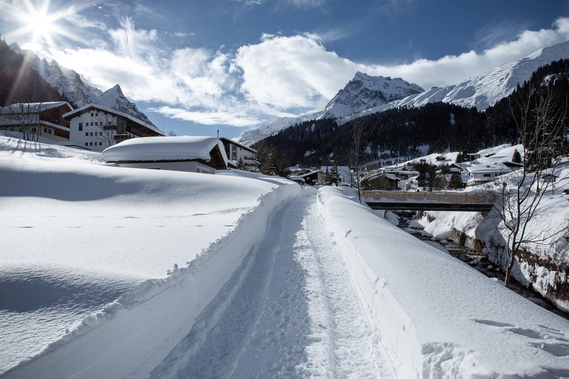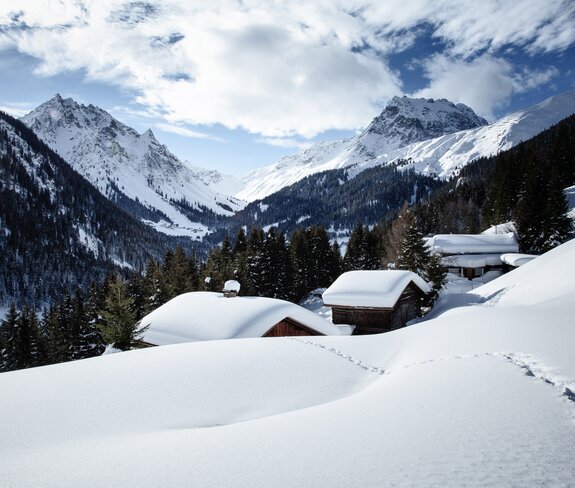 Eine schneesichere und aussichtsreiche Tour ist die Winterwanderung zum Röbimaisäß in Gargellen, dem höchstgelegenen Dorf des Montafon auf 1.423 Meter. Schnee ist hier oben quasi garantiert, denn schon bei der Fahrt von St. Gallenkirch durch das enge Gargellental säumen gewaltige Schneewände mit mehr als einem Meter Höhe die Straßen. Kein Wunder: Im Ortsgebiet von Gargellen fällt im Schnitt pro Jahr mehr Niederschlag als im übrigen Montafon.